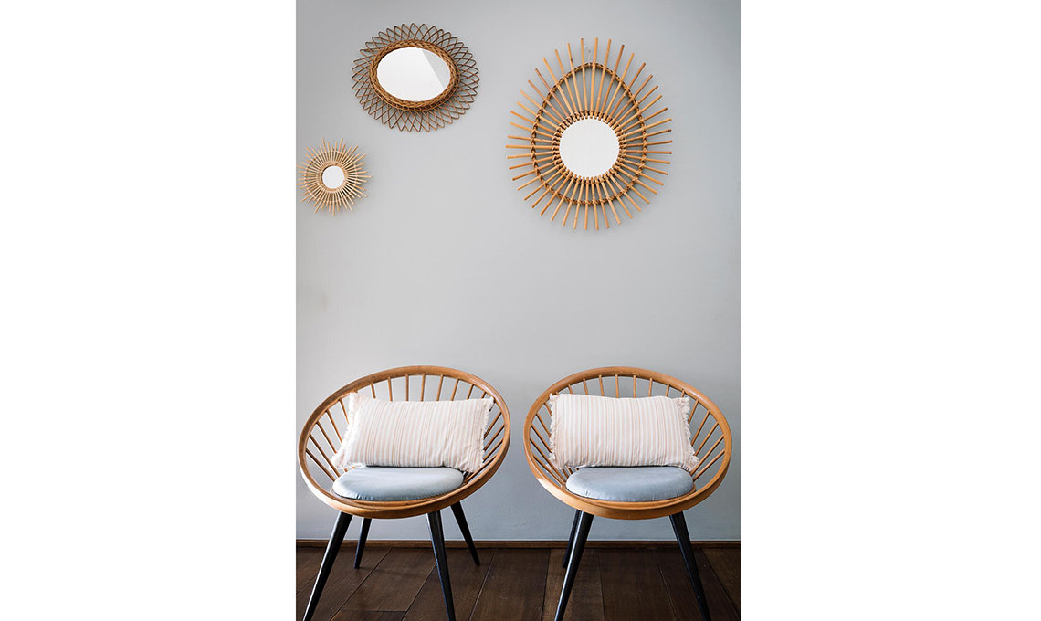 è dipinta con la pittura decorativa Oval Room [Farrow&Ball]. Collezione di specchi in rattan, simili da [Maisons du Monde], [La Redoute], [Leroy Merlin].
