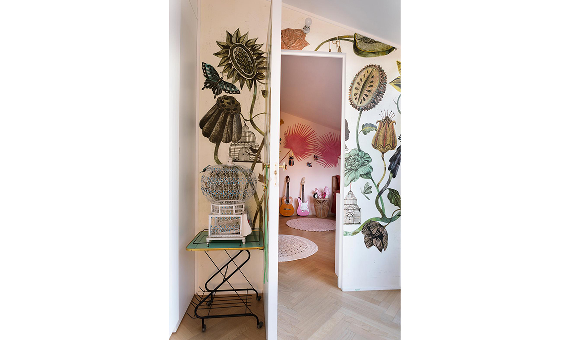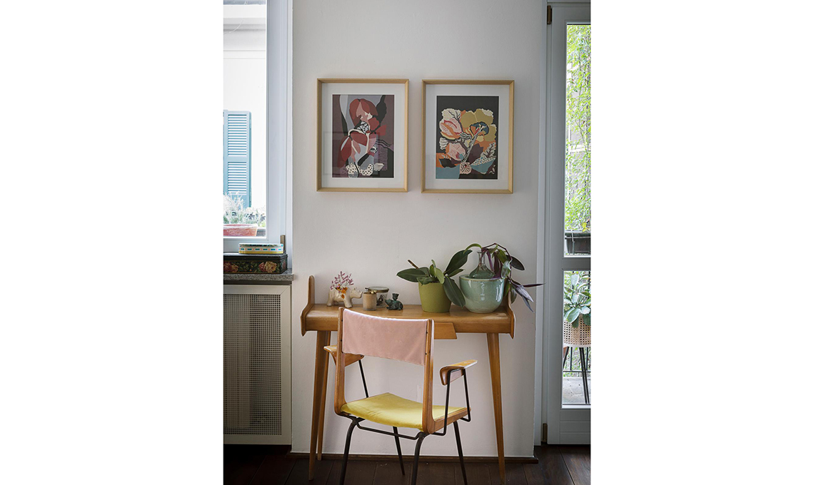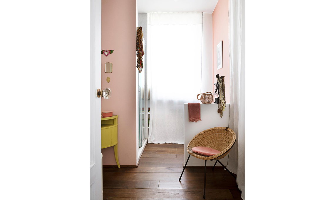 «La casa era già ristrutturata – racconta Sabina – ho sostituito il pavimento in ardesia della mansarda con un parquet a spina di pesce e valorizzato gli infissi originali, come le porte vecchia Milano e il camino in marmo». Per dare personalità, Sabina si è dedicata allo studio dei colori e alla decorazione. «La palette l’ho costruita partendo dal verde salvia e dal terracotta rosato» racconta. I due colori rimbalzano qua e là, con armonia, in tutta la casa: dalle pareti, ai cuscini, alla carta da parati.