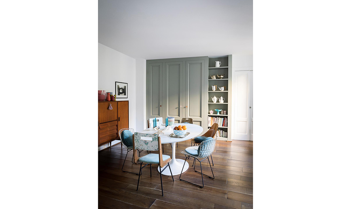 Attorno al tavolo Tulip [Knoll]: coppia di sedie Anni ’50 di Carlo Ratti [Intondo], sedia Medea di Vittorio Nobili per Fratelli Tagliabue [Pamono], coppia di sedie Side Chair di Harry Bertoia [Knoll], sedia in vimini di Gian Franco Legler [Pamono].