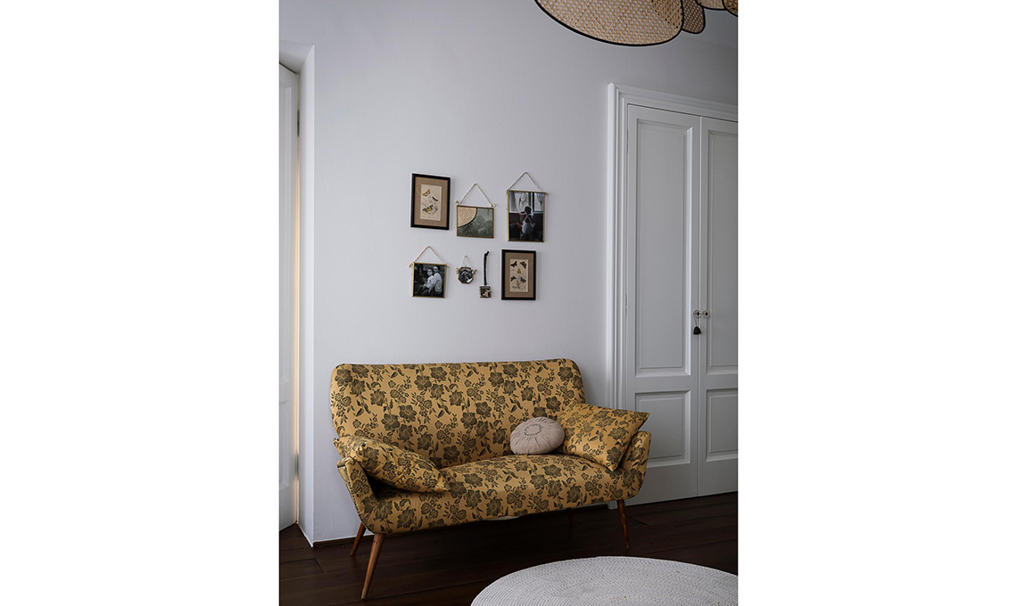 Il divanetto a fiori Anni ’50, acquistato al Mercatone dell’Antiquariato dei Navigli di Milano (si tiene ogni ultima domenica del mese) e conservato con il tessuto originale, è perfetto sulla parete grigio chiaro. Le stampe di farfalle vengono da libri del primo ’900.