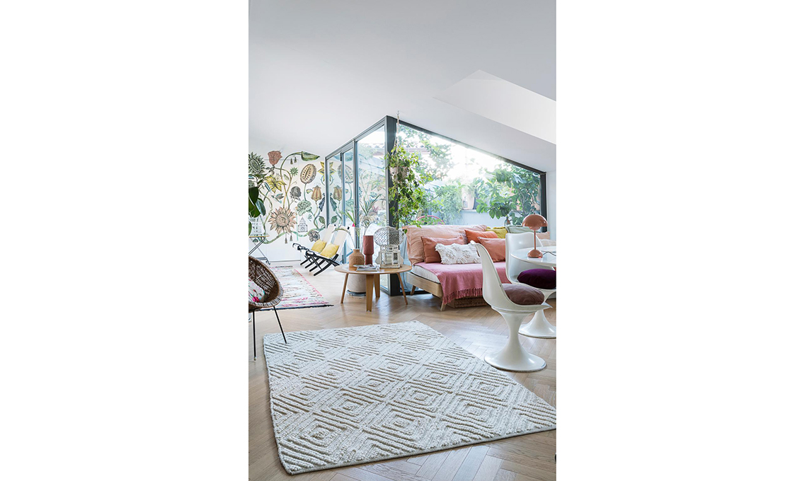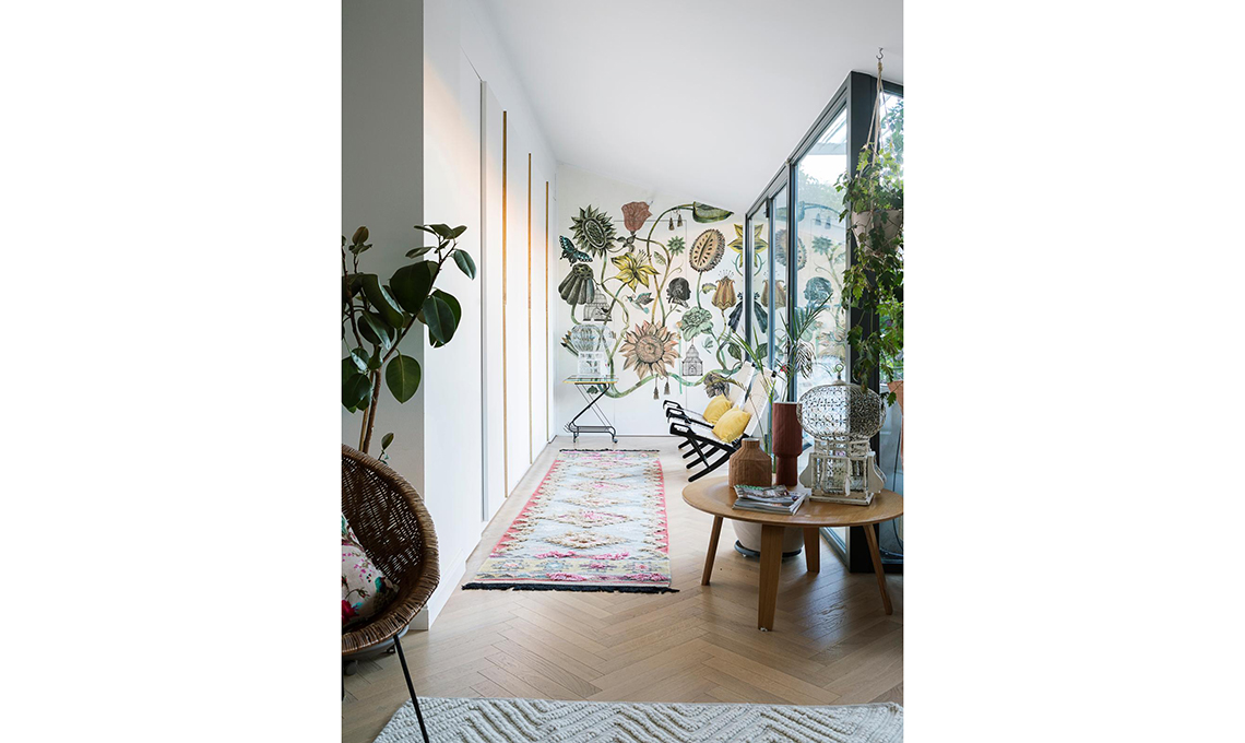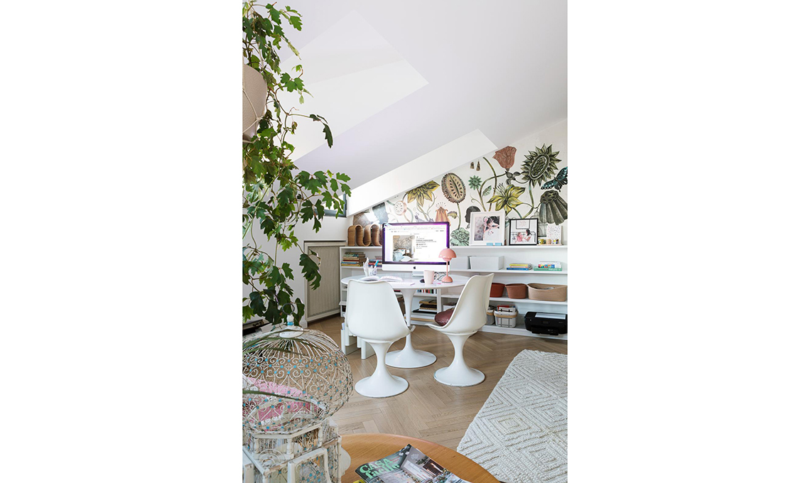 il terrazzino a tasca affacciato sui tetti. Al total white delle pareti e del soffitto a spiovente, Sabina ha abbinato un mood jungle, dove le piante si mixano alla scenografica wallpaper botanica.