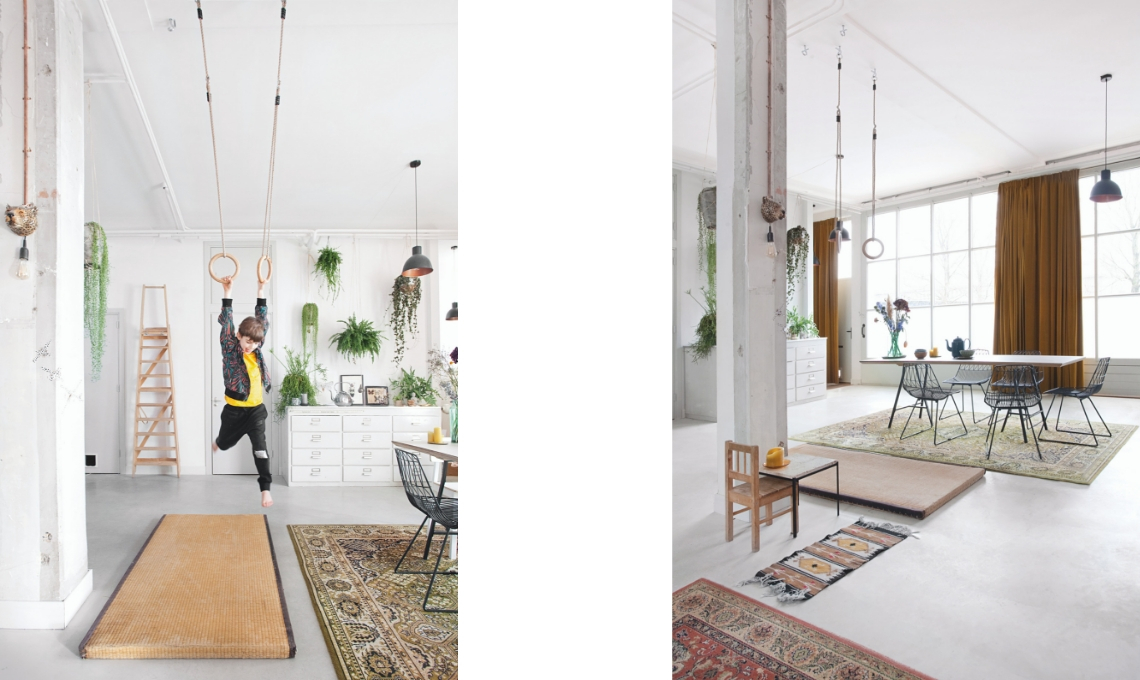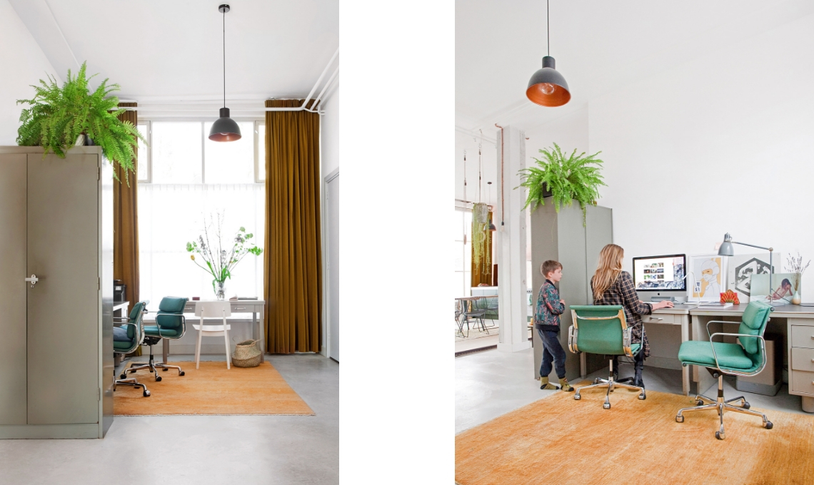 Erika è un mamma single e abita con suo figlio Braz nei locali della vecchia P.h. Stuyt & Co., una ex-azienda tessile costruita nel 1963 ad Amsterdam: lo spazio perfetto per creare la casa-ufficio dei suoi sogni.