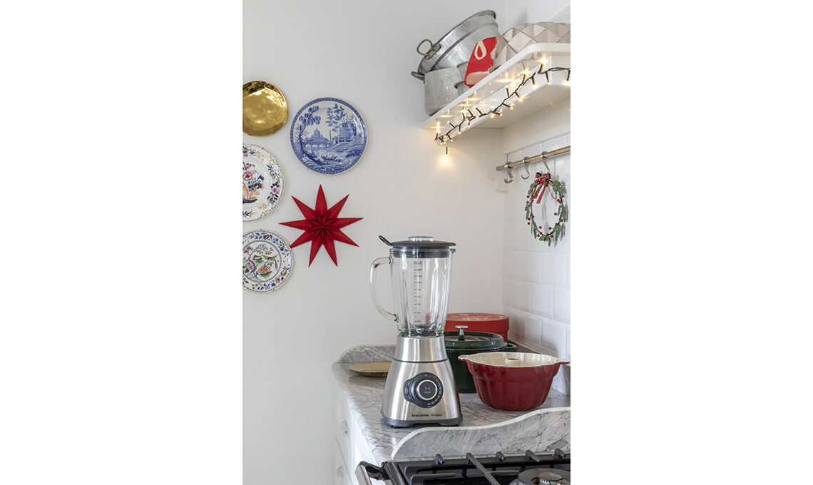 La tavola di Natale ha tovaglia bianca in lino [La Fabbrica del Lino], piatti verdi con animali Wood [Bordallo Pinheiro, il piano € 19,50, quello con l’alce € 15], bicchieri a calice [Villeroy & Boch], segnaposto a pallina con sonaglio [Europlanet Casa] e a cuore più albero di biscotti di [Pasticceria Dolce Roma], stelle di carta [Silvia Raga], rami decorativi centrotavola di [EDG Enzo De Gasperi € 11 cad] come i portacandele verdi sul top della cucina; candele bianche [Vertecchi].