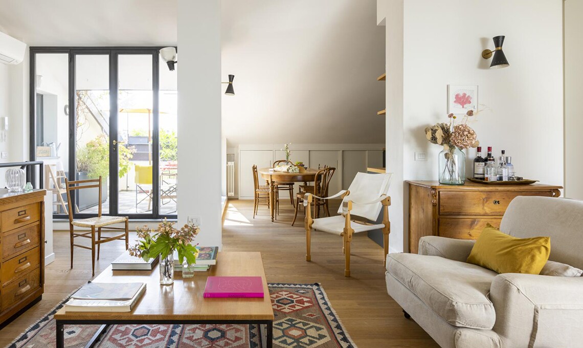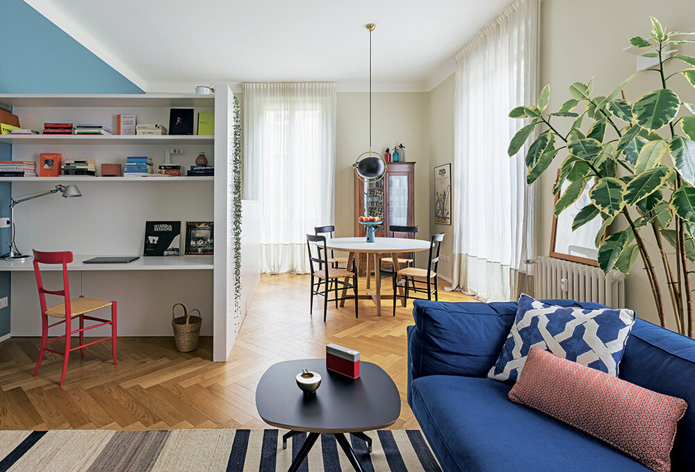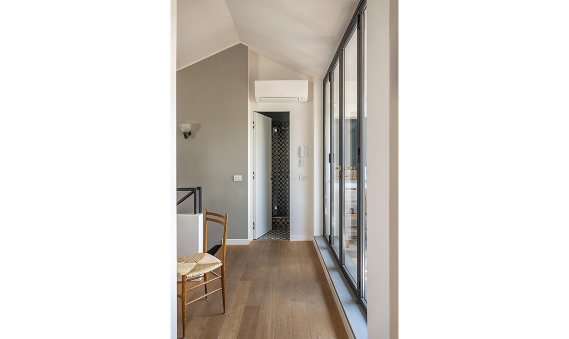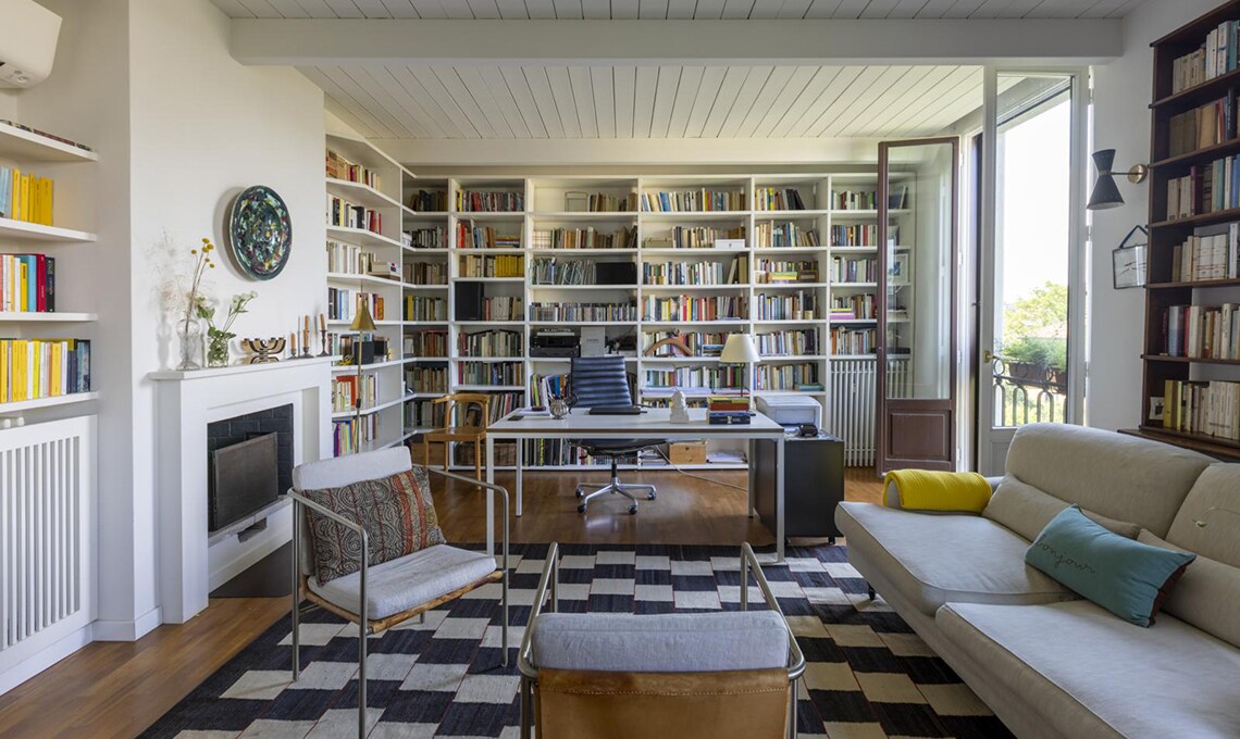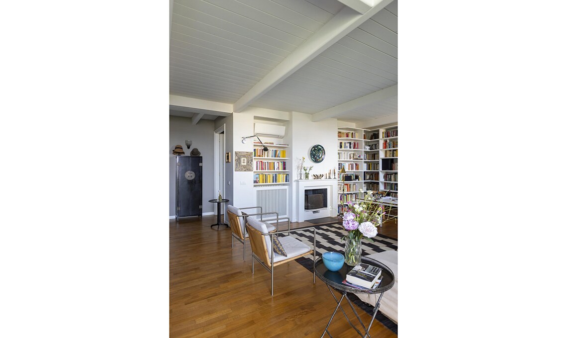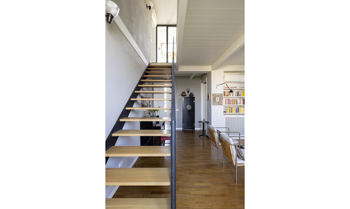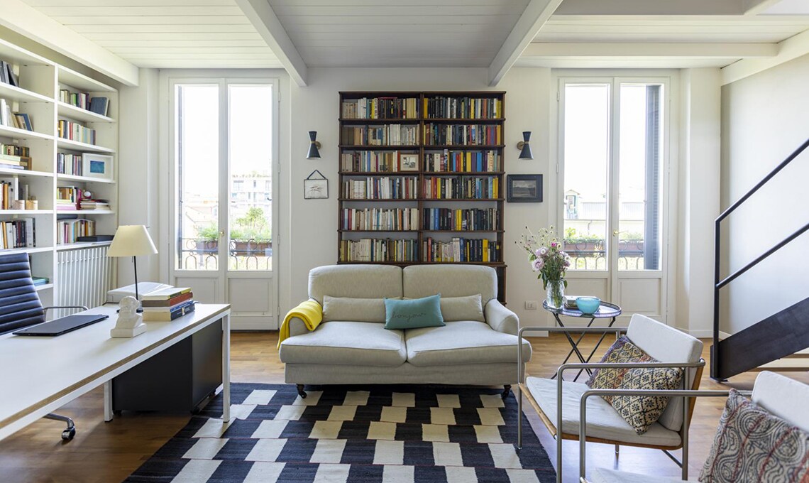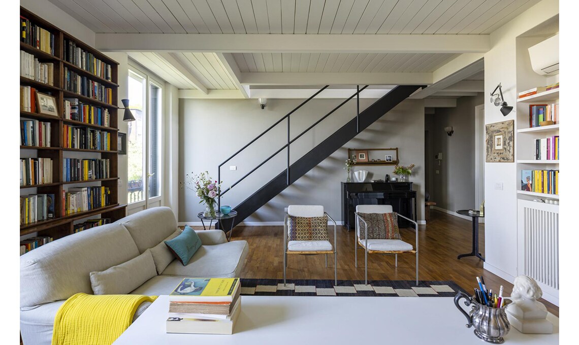 Dopo che i figli hanno lasciato il nido, Michele e Vittoria si ritrovano in un appartamento su due piani, in zona Bocconi a Milano, ormai inadatto alle loro esigenze. La loro vita domestica si concentra al livello inferiore, mentre la zona superiore, dove c’è un bel terrazzo incastonato tra i tetti, oggi è utilizzata soltanto come studio. Dilemma: cercare una nuova casa o piuttosto ristrutturare? Scelgono la seconda opzione e per i lavori si affidano all’architetto Betti Sperandeo, che con pochi, efficaci interventi cambia l’assetto dell’appartamento.