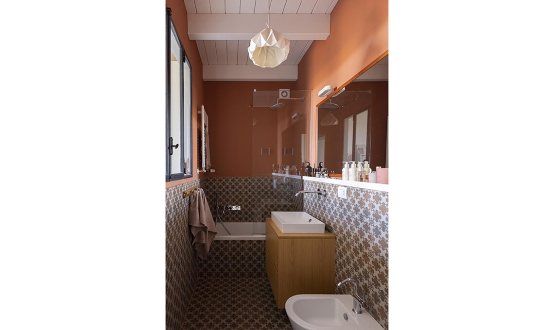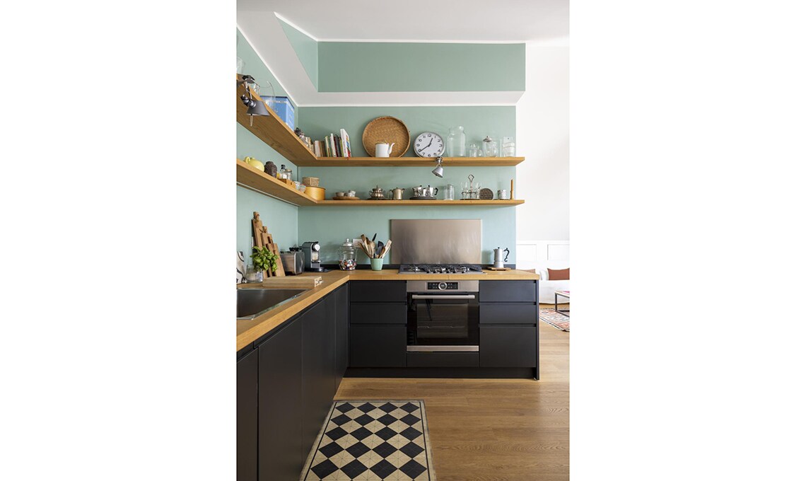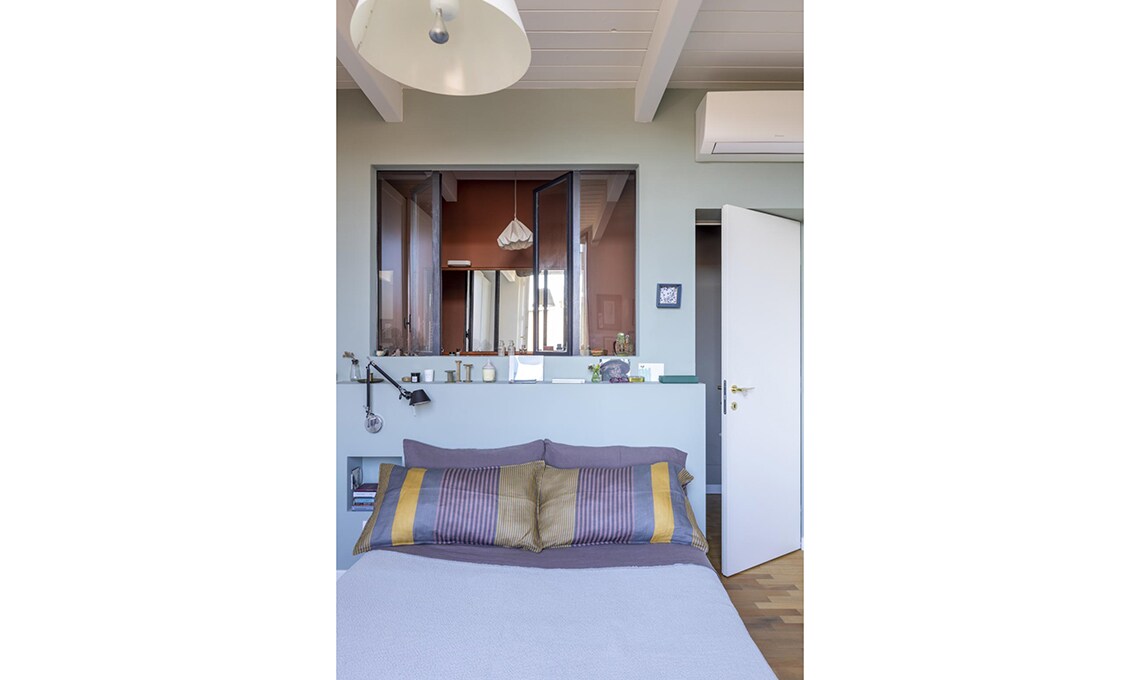 Pochi colori, utilizzati soltanto per alcune delle pareti, creano quinte scenografiche d’effetto, senza appesantire. Il segreto? «Ho usato toni lievi, desaturati, che non rubano luce» dice l’architetto. Una palette che infonde benessere al primo sguardo.