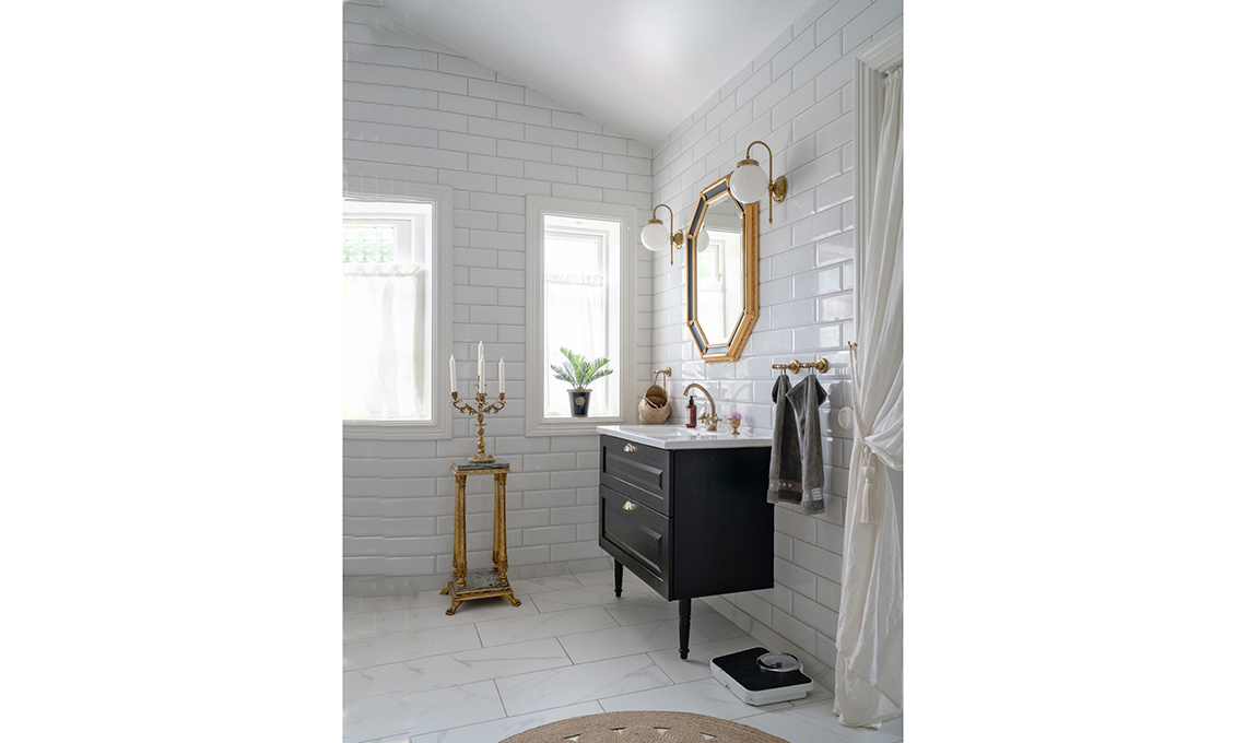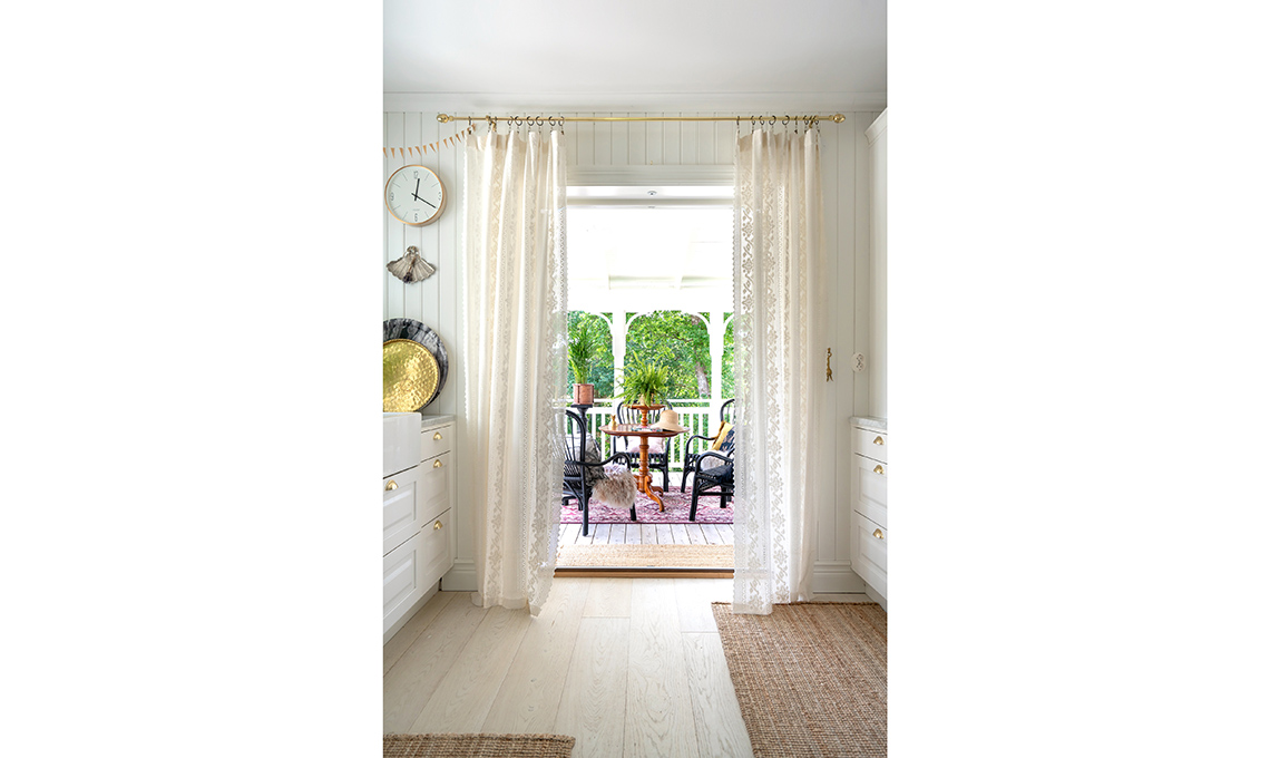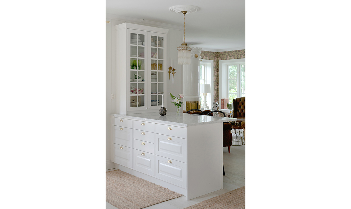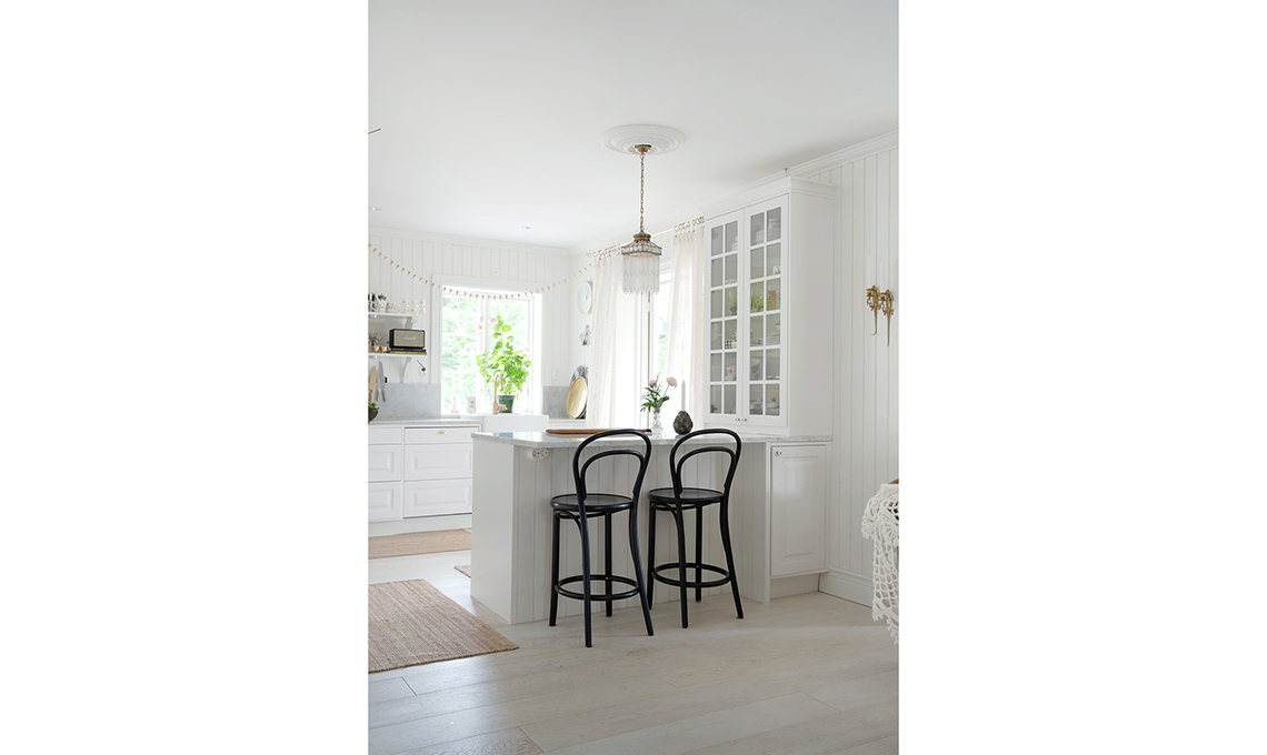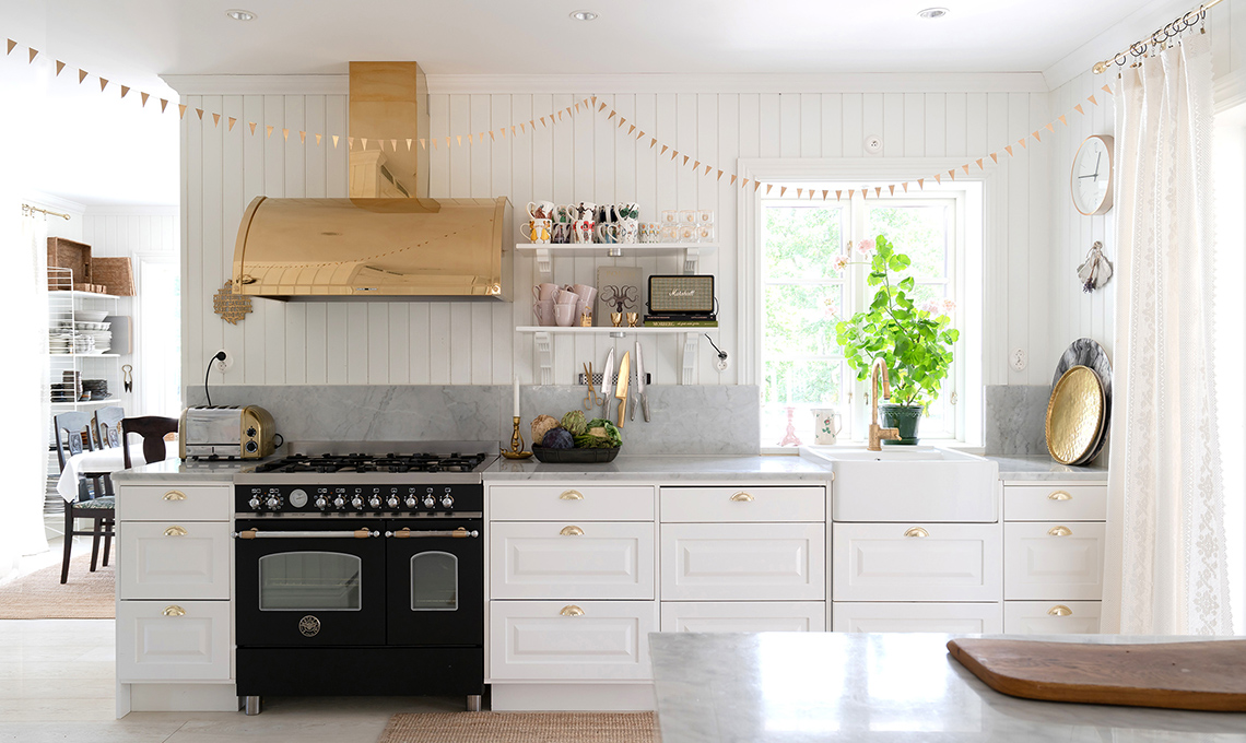 fa da divisorio naturale tra cucina e soggiorno e contribuisce a creare un unico spazio. I materiali usati non mancano di sottolineare l’importanza del mix: alla boiserie e alle basi dal linguaggio country si montano cappa, maniglie e bastoni per tende scintillanti d’oro: dei super classici,