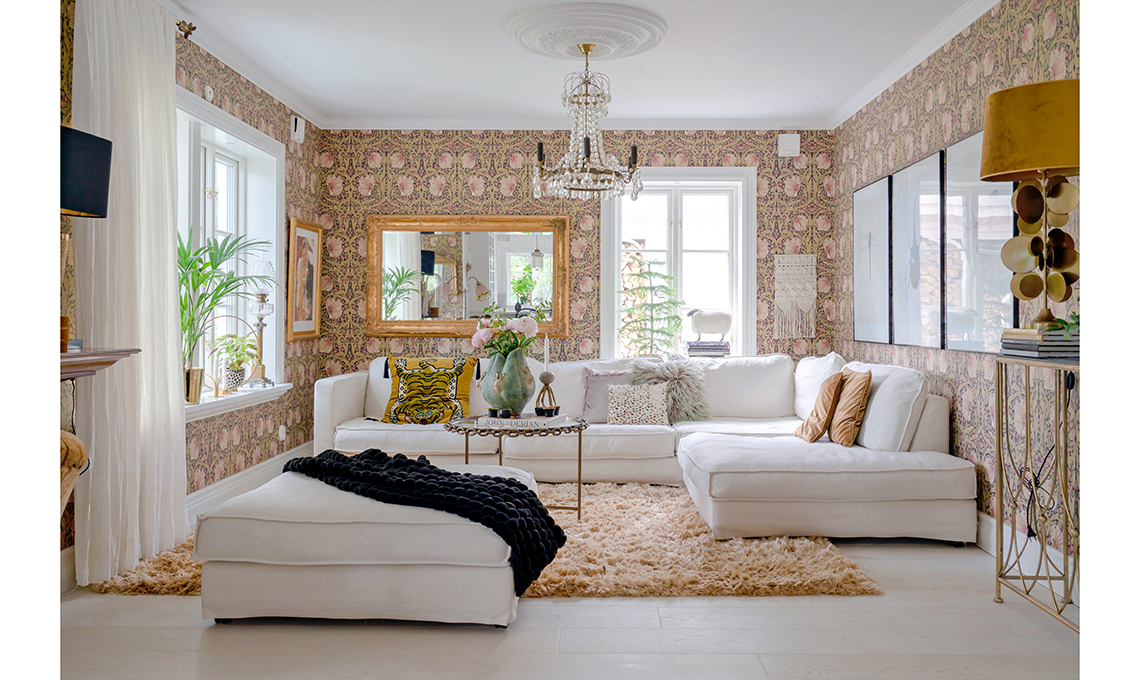 Il punto di inizio di questo look rétro è la carta da parati usata senza parsimonia: è Pimpernel, uno degli storici disegni del maestro William Morris, il fondatore del movimento artistico di tardo ’800 Arts and Crafts.
