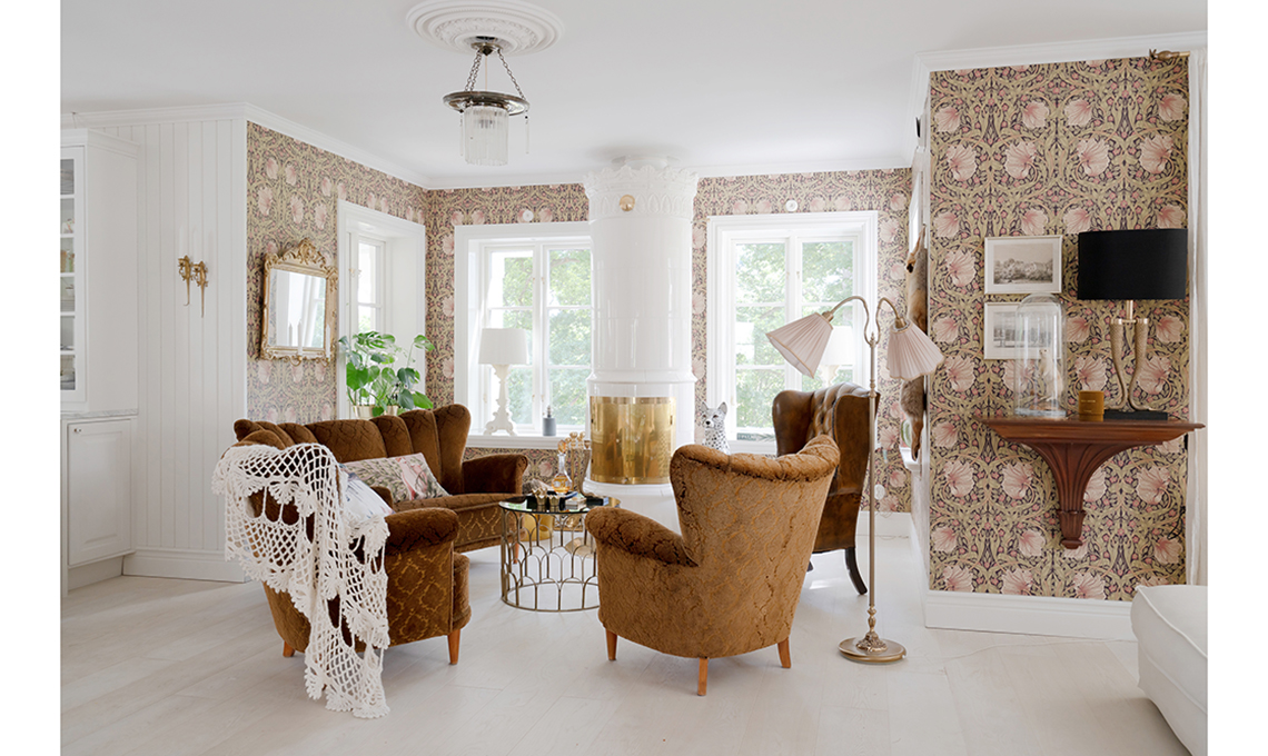 Carta da parati Pimpernel [Morris & Co.], stufa svedese [Gabriel Kakelugnar]: in Italia, puoi acquistarle presso [Arte Calore]. lampada da terra [Oscar&Clothilde]. Sul davanzale, lampada Bourgie [Kartell]. Cuscino tigrato [House of Hackney]. La console a muro proviene