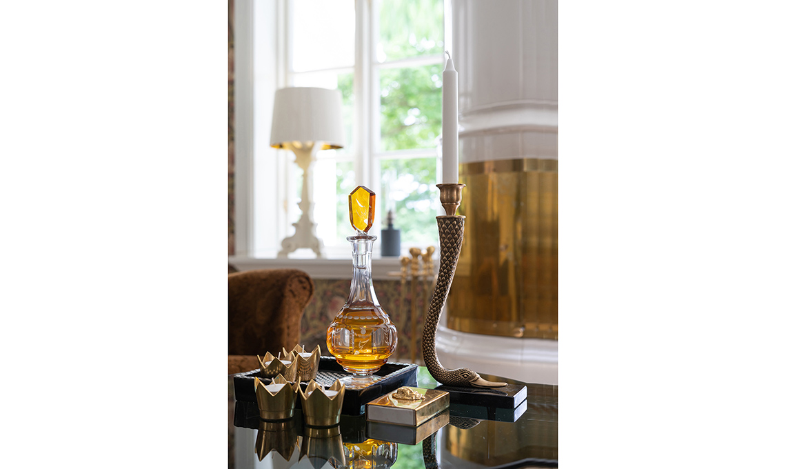 Vassoio rotondo dorato simile a Conan [Bloomingville]. A parete, orologio Clock Couture [House Doctor]. Nel portico, i mobili in rattan e carrello di servizio [Sika Design].