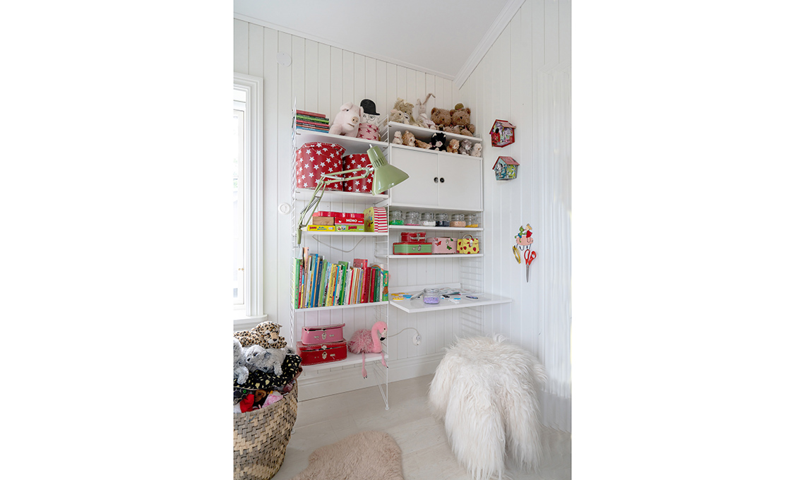 Libreria componibile [String], con vani chiusi da ante e scrivania. La lampada industriale è stata comprata in un mercatino.