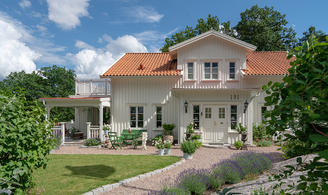 Markus è un eccelente giardiniere: la progettazione dell’esterno, iniziata con la messa a dimora di 250 lillà, è opera sua. Ha una predilizione per i viottoli di sassi che incorniciano delle aree relax dal gusto romantico. «Siamo stati sul posto diverse volte per studiare l’esposizione dell’intera casa: al mattino il sole colpisce il portico sulla cucina prima di ruotare e tramontare nel giardino d’inverno» racconta orgoglioso.