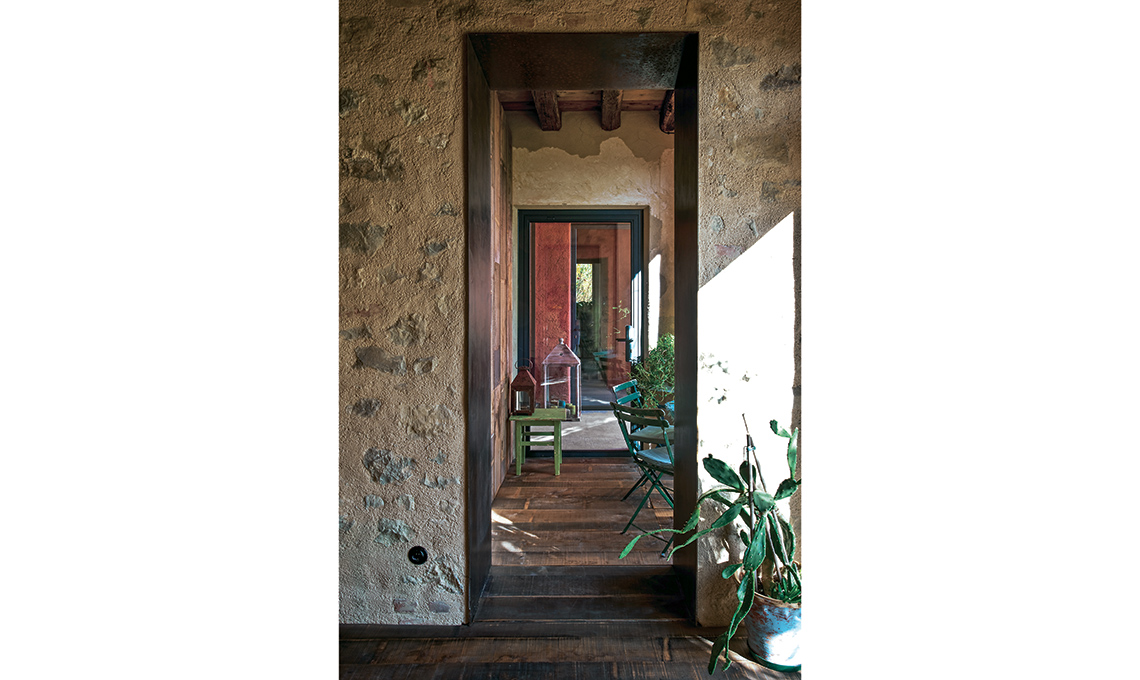 La pavimentazione in legno sottolinea la continuità fra le tre sale al piano terra, che si aprono una dopo l’altra. «Le assi, di misure diverse, sono state recuperate da un falegname locale: comporle è stato un lavoro certosino, ma il risultato è sorprendente, sembrano qui da sempre!» esclama Roberta. Nel salottino dalla foto