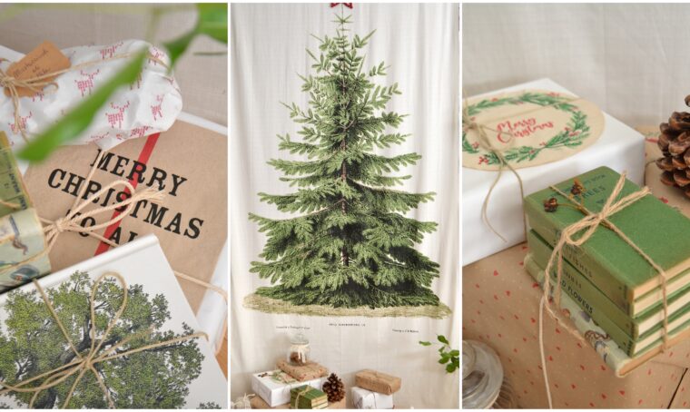 Poltroncine Anni ’50 e cuscini in velluto [Nuance], plaid [Croff € 32,99], lampada da terra [Ikea, fuori produzione], pacchi realizzati con carta decorativa Quadretto Verde, Pavonata Verde Provenza Verde e Le Voci del Bosco [Tassotti]. Sul tavolino, tazza Onda Set Tè [Society Limonta € 85] più candelabro e candele [Croff].