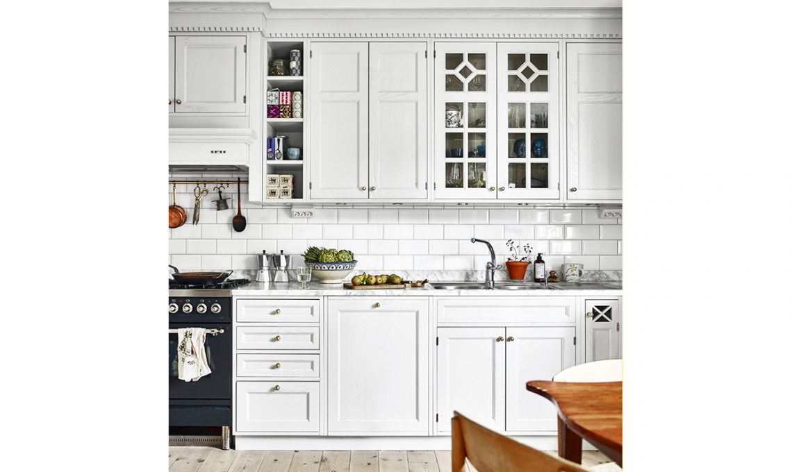 La cucina è in un grigio molto chiaro, col top in marmo di Carrara. Una simile, con pensili a vetrina e cornice superiore, è Baltimora [Scavolini], in rovere bianco. Tradizionali e chic anche le piastrelle, rettangolari e bianche.