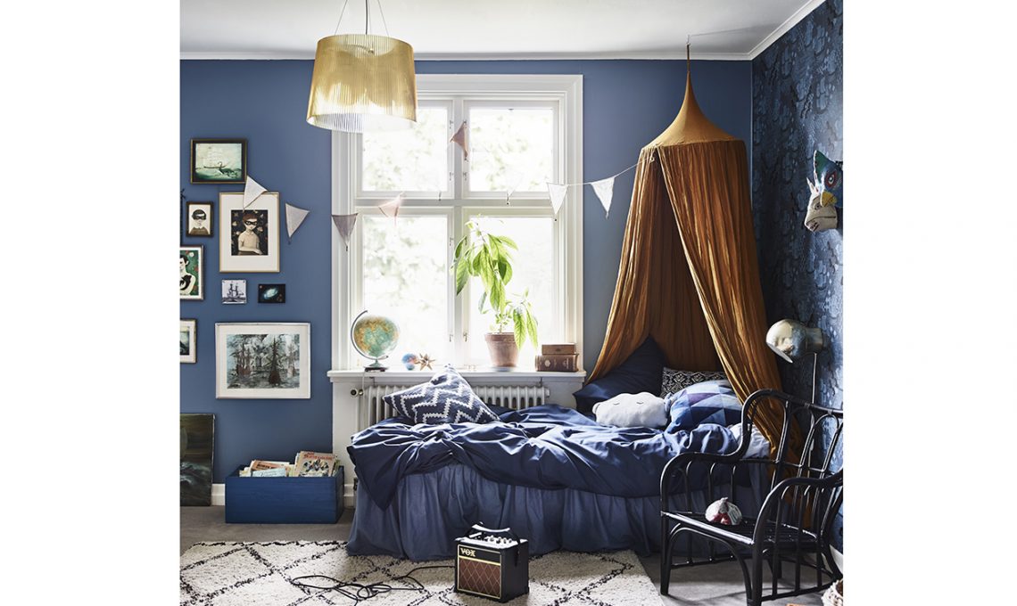 Il più piccolo di casa ha una stanza tutta blu e una parete è tappezzata con l’immaginifica wallpaper Ithaque con vascelli e cavalli [Nobilis €118,50 il rotolo da cm 100X52h]. Sospensione Gè [Kartell, ø cm 37 h €160 circa], con diffusore giallo. Un soffice tappeto chiaro scalda e rischiara. Festoni e baldacchino di [Mokkasin].
