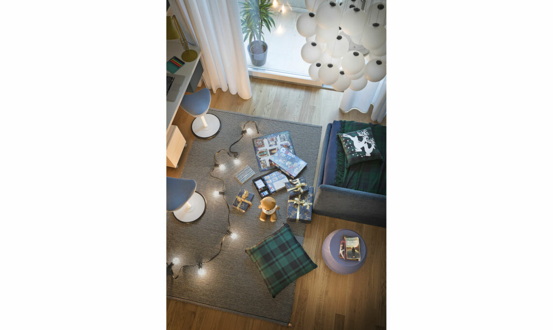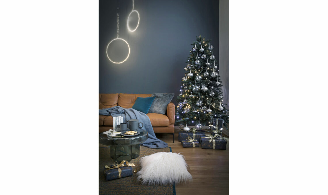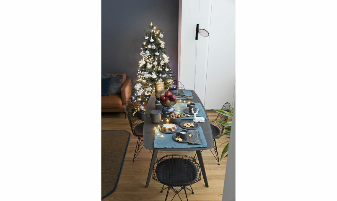 La moodboard riassume lo stile della casa! cuscini: pelliccia eco La Perla [Fazzini], petrolio [L’Opificio], bianco (pag. a fianco) [Croff]. Lampade: a orsetto Toy Moschino by Jeremy Scott [€210] e Lantern [€196] e a Led portatile, entrambe [Kartell], Easy Peasy design Luca Nichetto [Lodes €245]. panettone Delice con ricetta di Iginio Massari [€18,50], pandoro classico [€14,50] e bottiglia Cuvée spumante extra dry [€6,50] tutto in vendita su [hausbrandt.it]. Centrotavola Contour [Nude Glass €375]. Cervo, sfere decorative e ghirlande [Croff], sottopiatto [€106], posate, teiera [€42] e tazza [€19,95] design Maarten Baas [Valerie Objects]. Biglietti d’auguri e carta da regalo [Grafiche Tassotti].