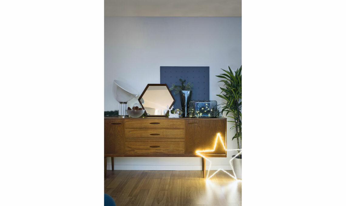 Credenza e specchio trovati su subito.it. Lampada Taccia small [Flos €890], opera d’arte Christopher Pisk, vasi blu Layers [€175] e grigio fumé Inca [€88] e ciotola Essence [€94] tutto di [Nude Glass]; stella luminosa e cervo in ceramica [Croff].