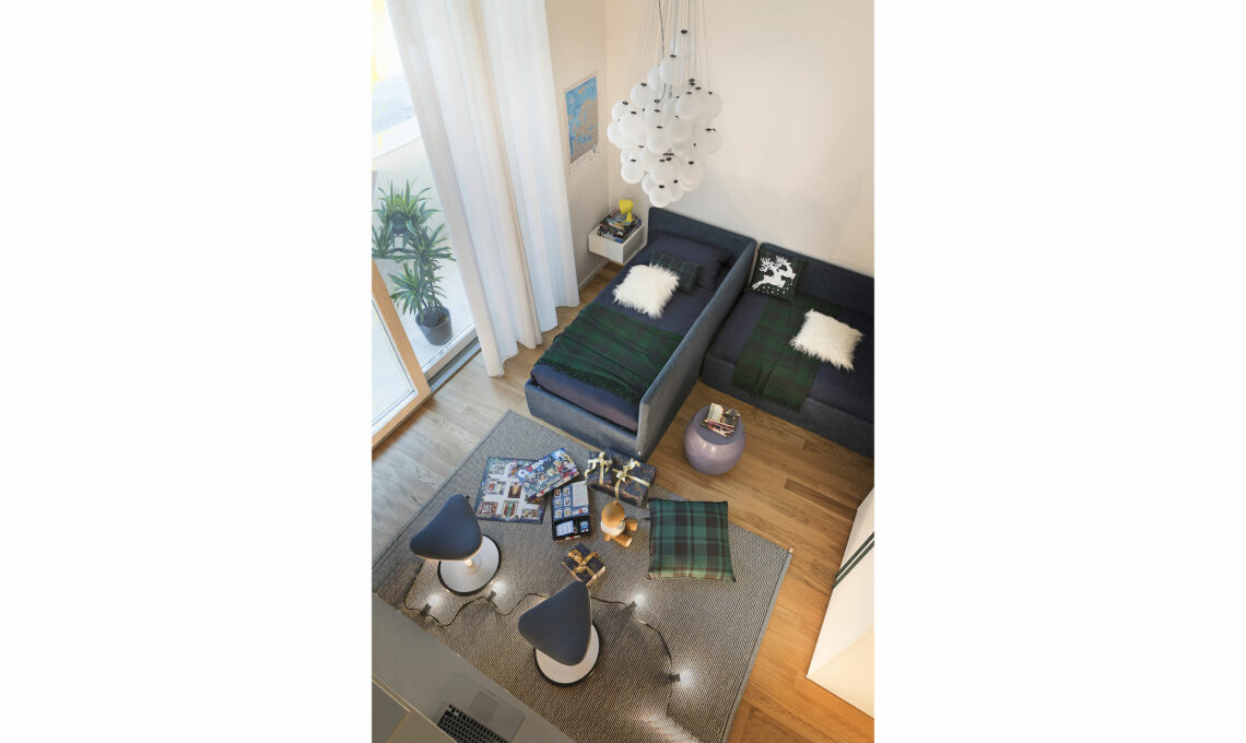 Lampadario Stochastic [Luceplan €1.543], camera coll. Kids Collection di [Moretti Compact]: in dettaglio, divani letto Bravo con box contenitore [cm 208x101x86 h €1.205 cad], armadio a due ante in frassino bianco con maniglie Stylus Big color pavone [cm 122,5x60x226h €643], gruppo scrivania con cassettiera su ruote [cm 202x50x175h €1.100].