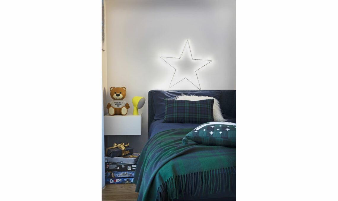 Completi copriupiumino, plaid, cuscini e luci decorative [Croff]. Sul comodino, lampada Binic gialla da tavolo [Foscarini €151] e Toy Moschino by Jeremy Scott [Kartell €210].