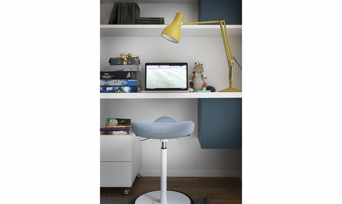 Camera coll. Kids Collection di [Moretti Compact]: gruppo scrivania con cassettiera su ruote [cm 202x50x175h €1.100]. Sgabello Move [Varier Furniture], lampada Type 75 Desk Lamp-Margaret Howell Edition [Anglepoise €220].