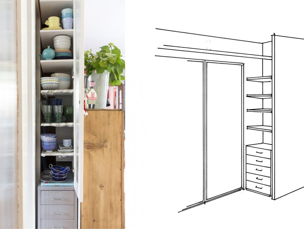 La pianta: la zona bagno ha preso il posto della ex cucina. E dov’era la toilette ora c’è il guardaroba. Nella zona giorno la parete tra le due stanze è stata abbattuta per unire cucina e living, ma se ne è conservata una porzione a cui è appoggiato un mobiletto. La camera da letto, lunga e stretta, ha un capiente armadio su misura.