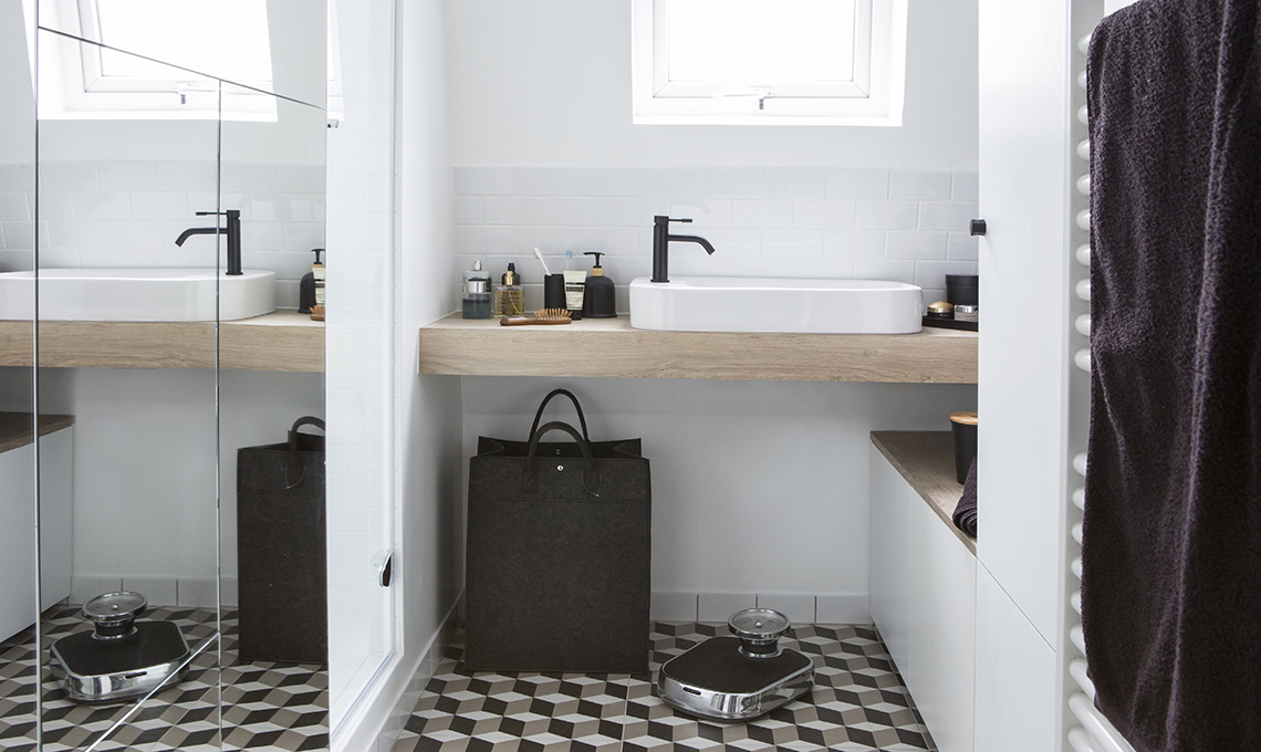 Bagno con lavabo, doccia e porta a specchio che si apre su un vano storage. Il pavimento ha piastrelle rétro [simili le Decoro Effetto 3D di Iperceramica, €25,99/mq].