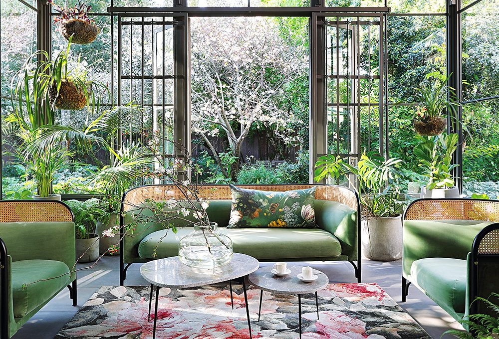 Il lettino ridipinto, il vecchio tappeto persiano e gli arredi in rattan sono tutti di recupero.