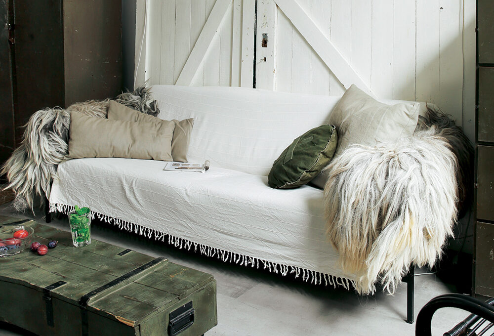 Tessile letto in lino [Linge Particulier], cuscini [La Redoute], poltroncina modello Acapulco [Madam Stoltz].
