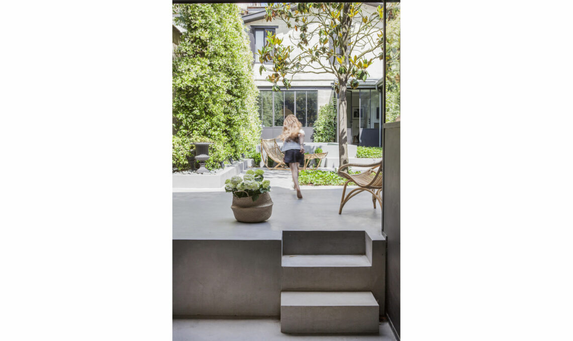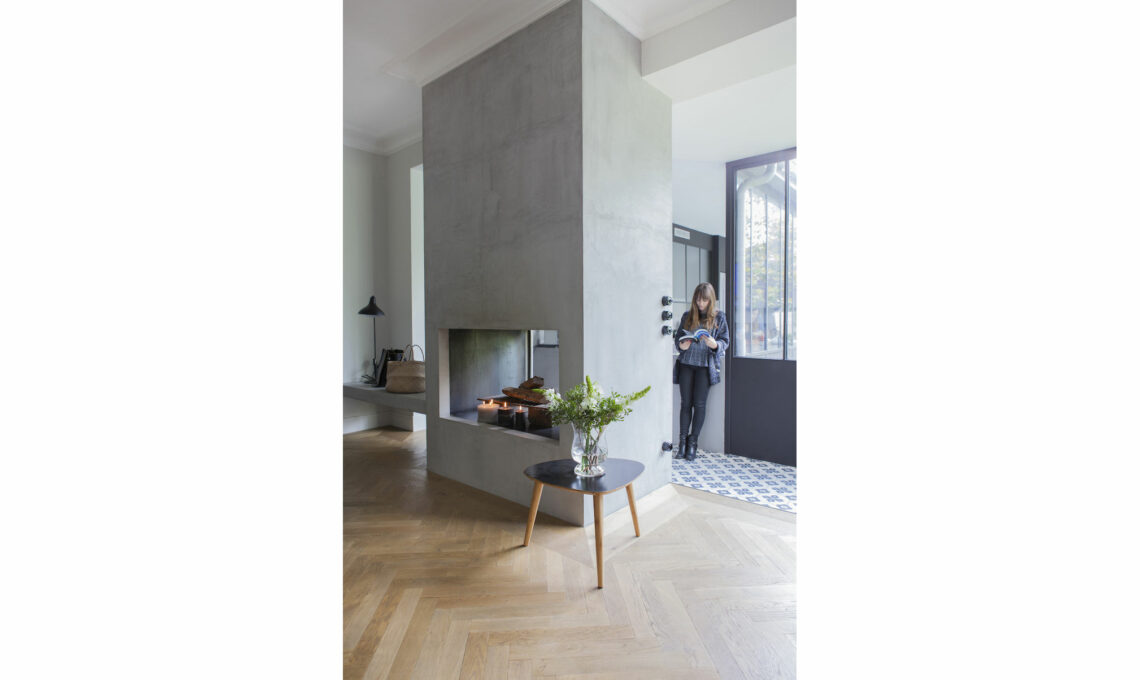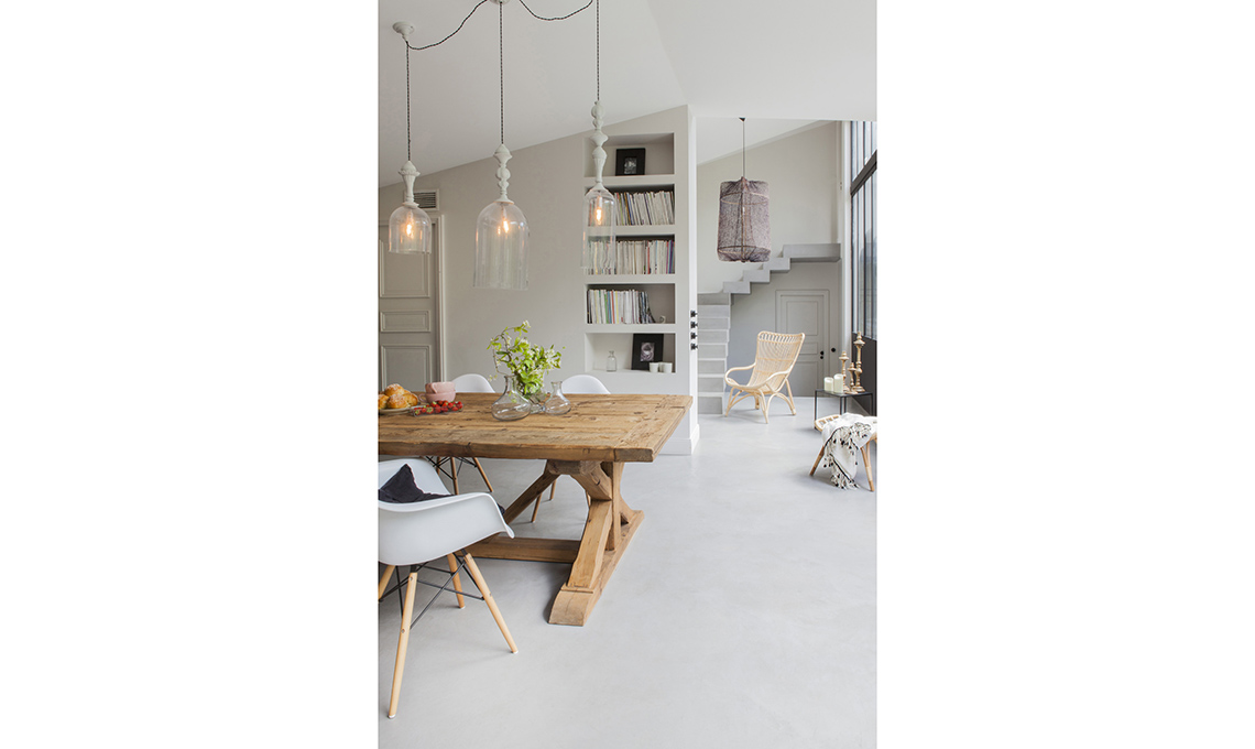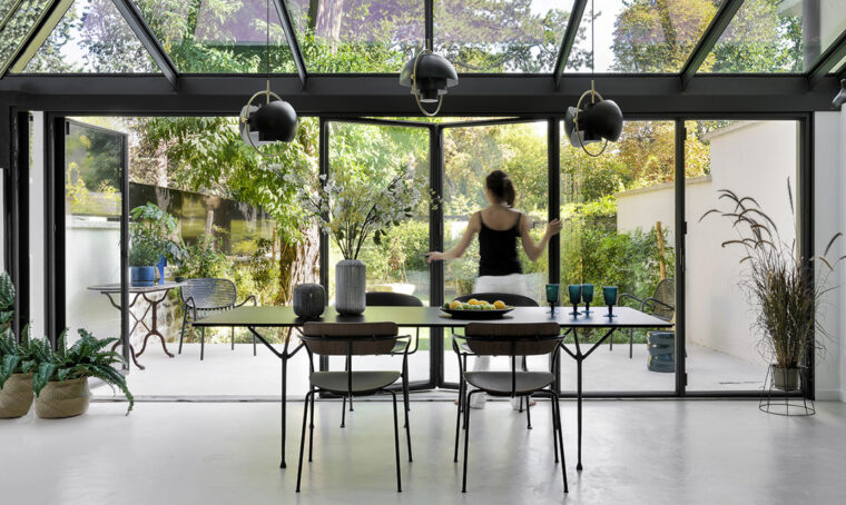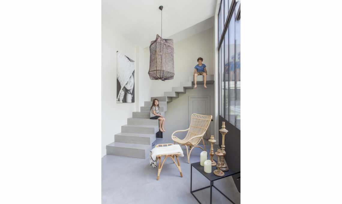 Dialoga con l’outdoor la portafinestra industriale disegnata da Stéphane [Atelier de Steel]. Estetica e funzionale la scelta del pavimento in cemento che prosegue anche all’esterno.