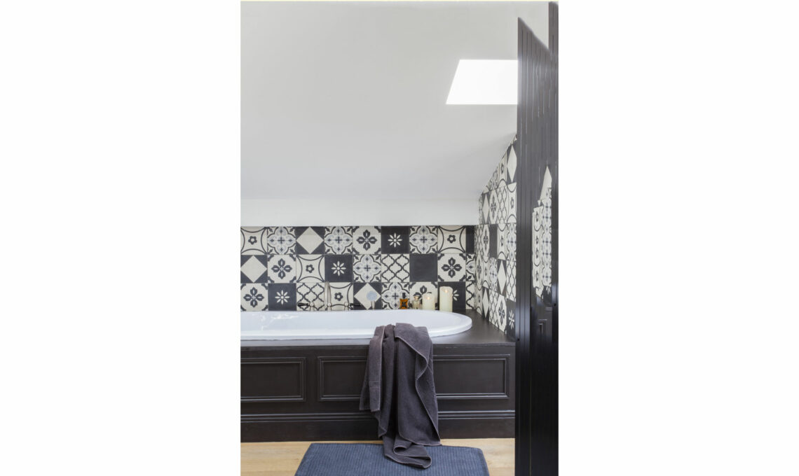Iper decorative le pareti che rivestono come un drappo la vasca e la cabina doccia: in uno scenografico patchwork tornano