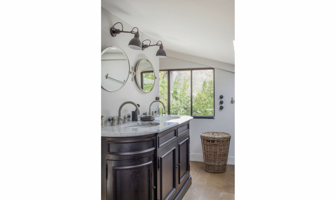 Divano Bruce di lino raw grigio e cuscini tinta unita, con micro fantasie e geometrie [Caravane], specchi sole in rattan dipinto di nero [KOK Maison], applique Lampe Gras con asta e braccio orientabile [DCW éditions].