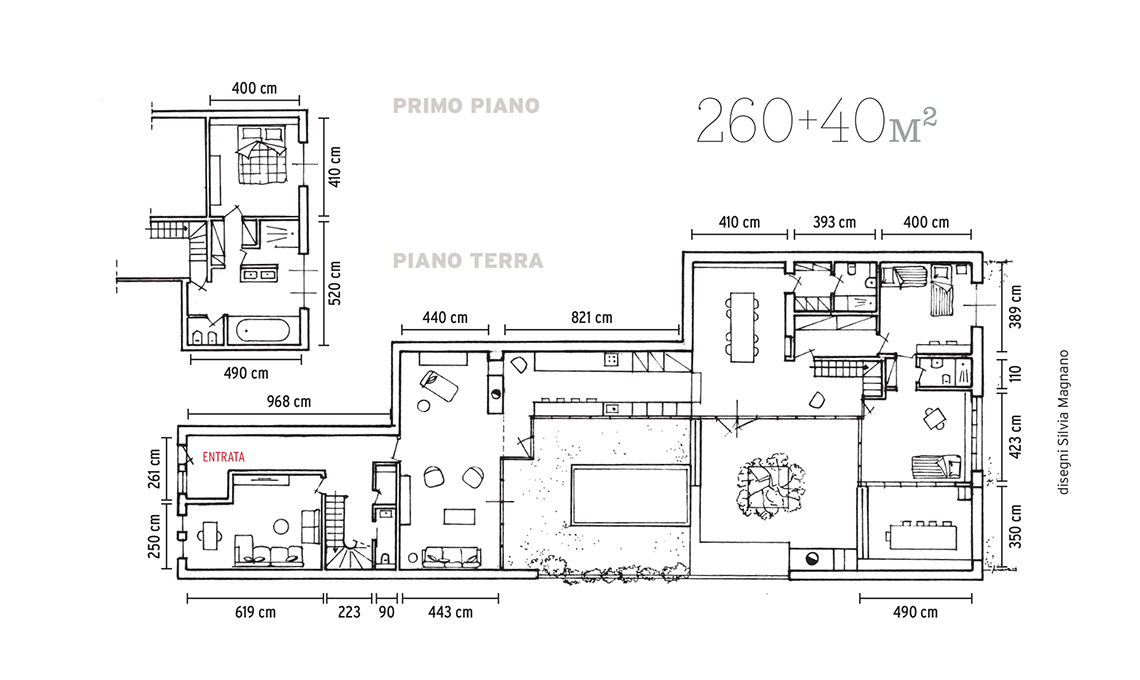 Sospensione Beat Fat Pendant, in ottone [Tom Dixon, ø cm 52x52,4h €1.080], credenza con cassetti [Fancy Home Collection]. A terra, cementine decorate [Demosaica].