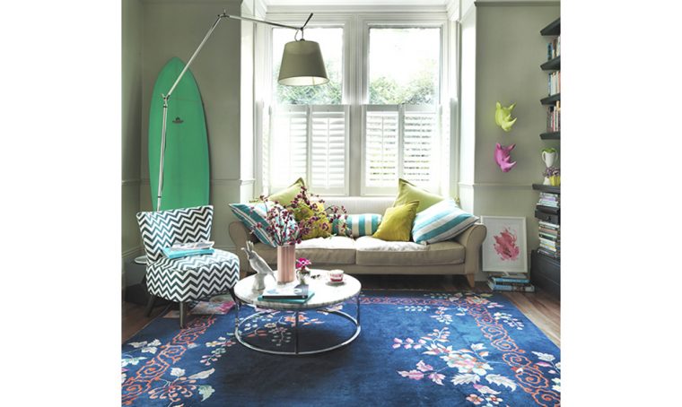 Osserva questo angolo: le poltrone brutaliste Anni ’60, in legno di quercia, e il tappeto raw sono elementi pesanti controbilanciati dalla leggerezza del tavolino cromato e dall’azzurro pastello