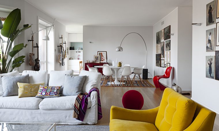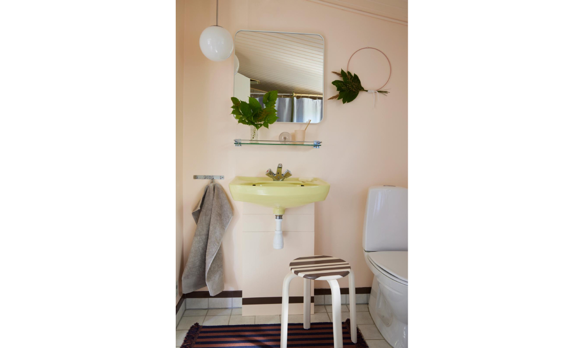 L’uso attento dei colori caratterizza anche il bagno, dove il bordo scuro a contrasto con il tono delicato delle pareti dà maggior profondità. E il lavabo giallo è una deliziosa nota pop! Il lavabo è di riciclo, se cerchi modelli colorati simili, guarda quelli di: [Ex.t], [Ceramica Cielo], [Simas], [Colavene] e [Antoniolupi].