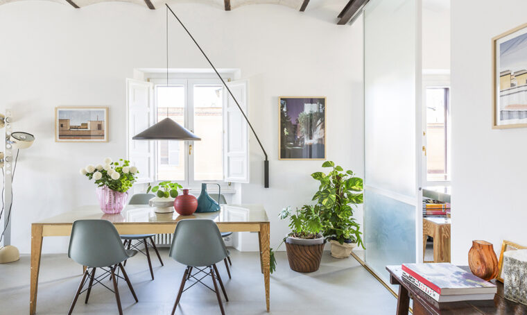 Un’alcova separata con un tenda che si apre sul soggiorno è l’ingegnosa soluzione trovata da Katrine per aggiungere i posti letto mancanti. Il living è collocato nell’ex giardino d’inverno e mantiene la quota ribassata che lo isola dal pranzo in modo soft. La tenda ha doppia funzione: garantisce la privacy dell’alcova e cela la televisione.