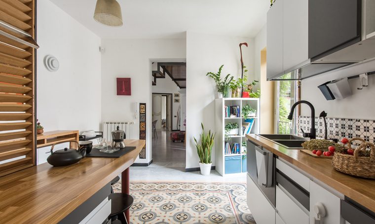 In corridoio le strisce salmone e verde salvia del pavimento dilatano lo spazio, danno movimento e creano un effetto sorpresa che si armonizza bene, però, con il parquet di recupero color cielo.