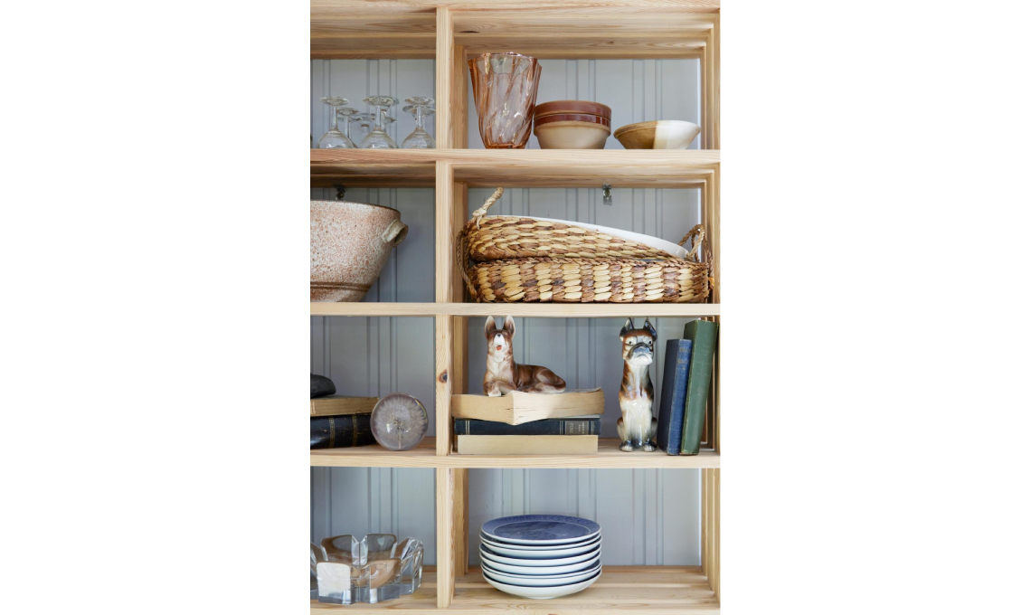 Accanto alla cucina Katrine ha allestito un angolo che adora. «È il mio luogo preferito perché sono circondata dagli oggetti che ho recuperato in tanti mercatini e negozi dell’usato» racconta. Una libreria composta di assi di legno grezzo a incastro è sufficiente per valorizzare vasi, volumi antichi e porcellane, tra le quali spiccano i piatti bianchi e blu della manifattura danese Royal Copenhaghen.