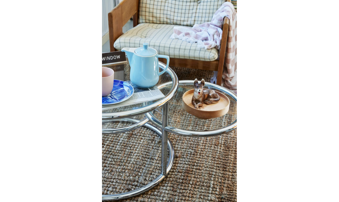 Il tavolino cromato ricorda l’Adjustable Table E 1027 di Eileen Grey, ancora in produzione [ClassiCon]. Trovi le poltrone vintage Anni ’60 disegnate da Tage Petersen su [pamono.it] e [design-market.eu].