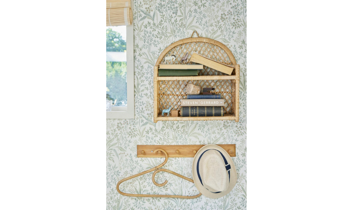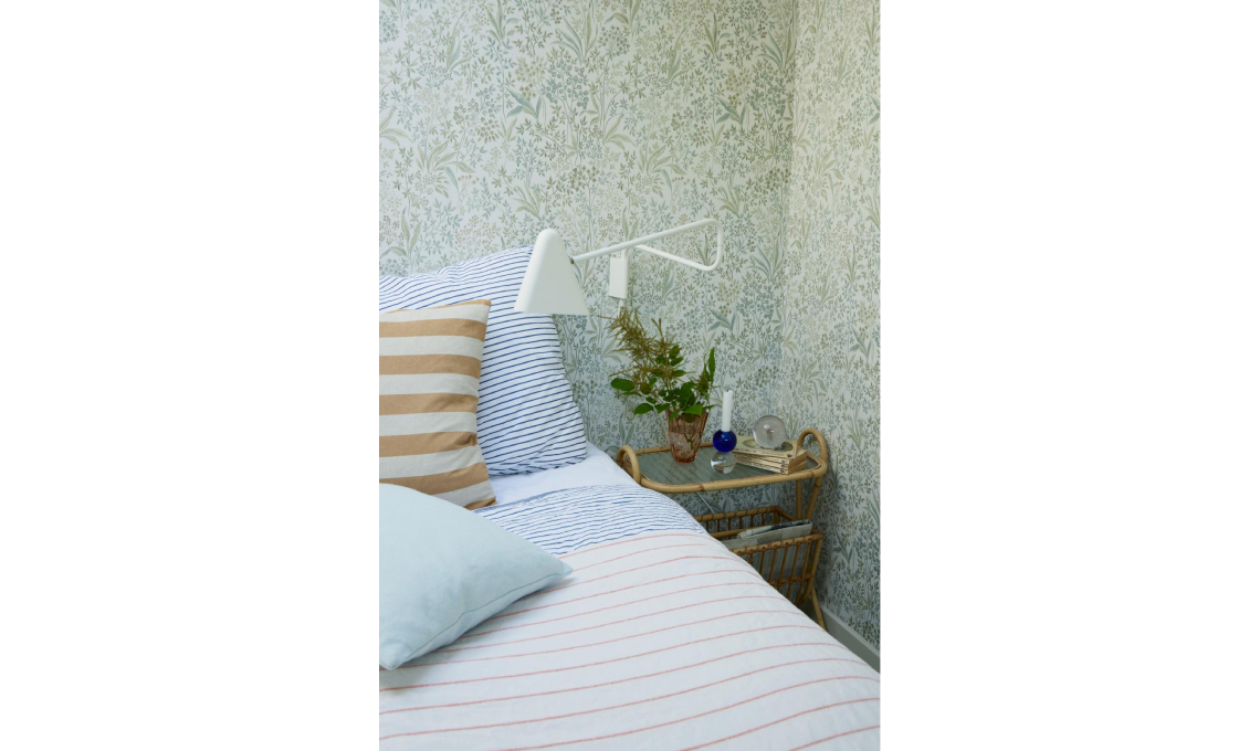 La stanza padronale è super minimal, ma la carta da parati floreale e la leggera mensola in bambù dalle forme curve le donano un tocco romantico. Di bambù anche il portariviste vintage che viene utilizzato come comodino.