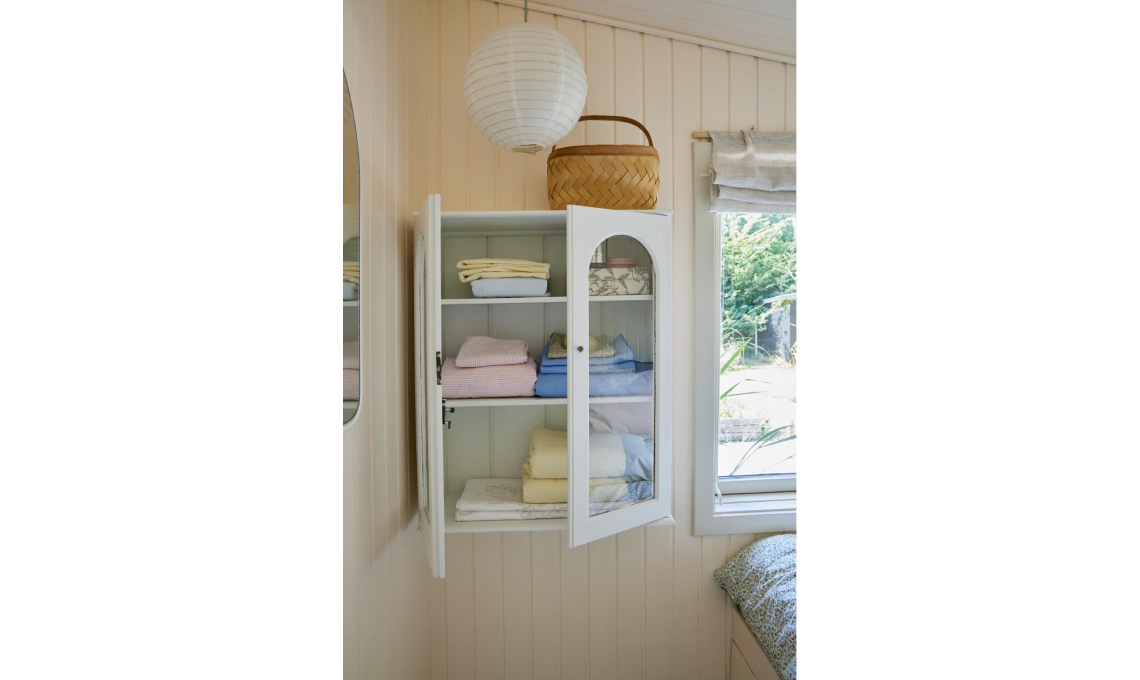 La vetrinetta di brocante è diventata un contenitore sospeso per la biancheria delle camere da letto. Ma si può utilizzare anche come piccola libreria. Pittura alle pareti Soft Touch [Jotun],