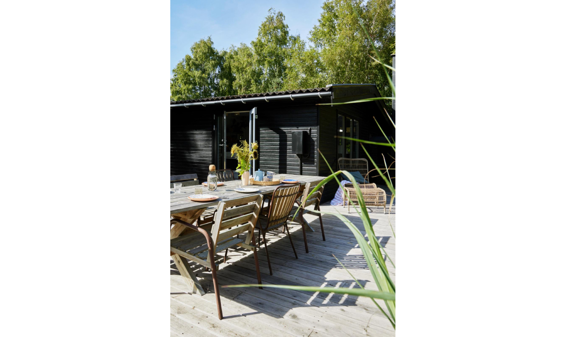 Il deck che circonda il cottage è stato costruito da Katrine insieme al padre con assi di legno in finitura naturale, nel classico stile nordico che crea continuità tra interno ed esterno. Per sfruttare al meglio le ore di sole, l’area colazione è separata dalla zona pranzo.