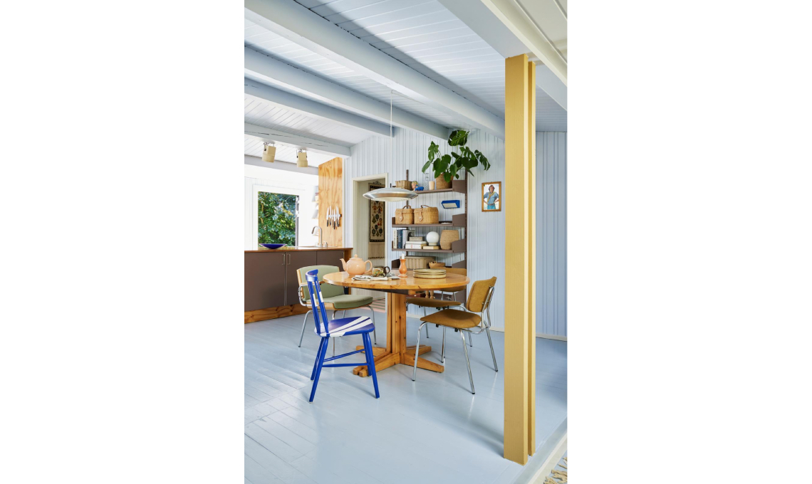 Nella zona pranzo la scaffalatura in metallo è dipinta nello stesso tono delle ante per integrarsi nello stile dell’ambiente, da usare anche come office. La sedia cobalto è l'elemento eye-catcher che aggiunge un accento vivace alla palette di toni naturali. È simile ai modelli J46 di Poul M. Volther [FDB Møbler], Tressia