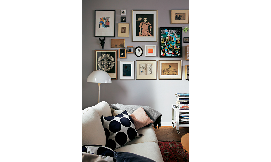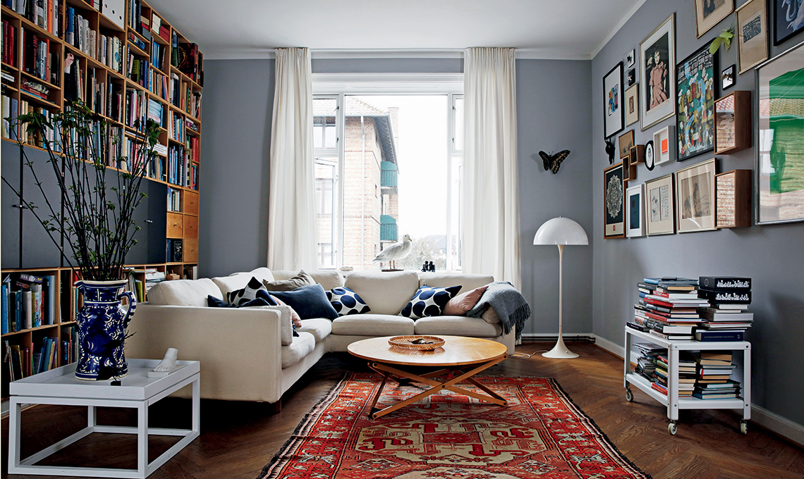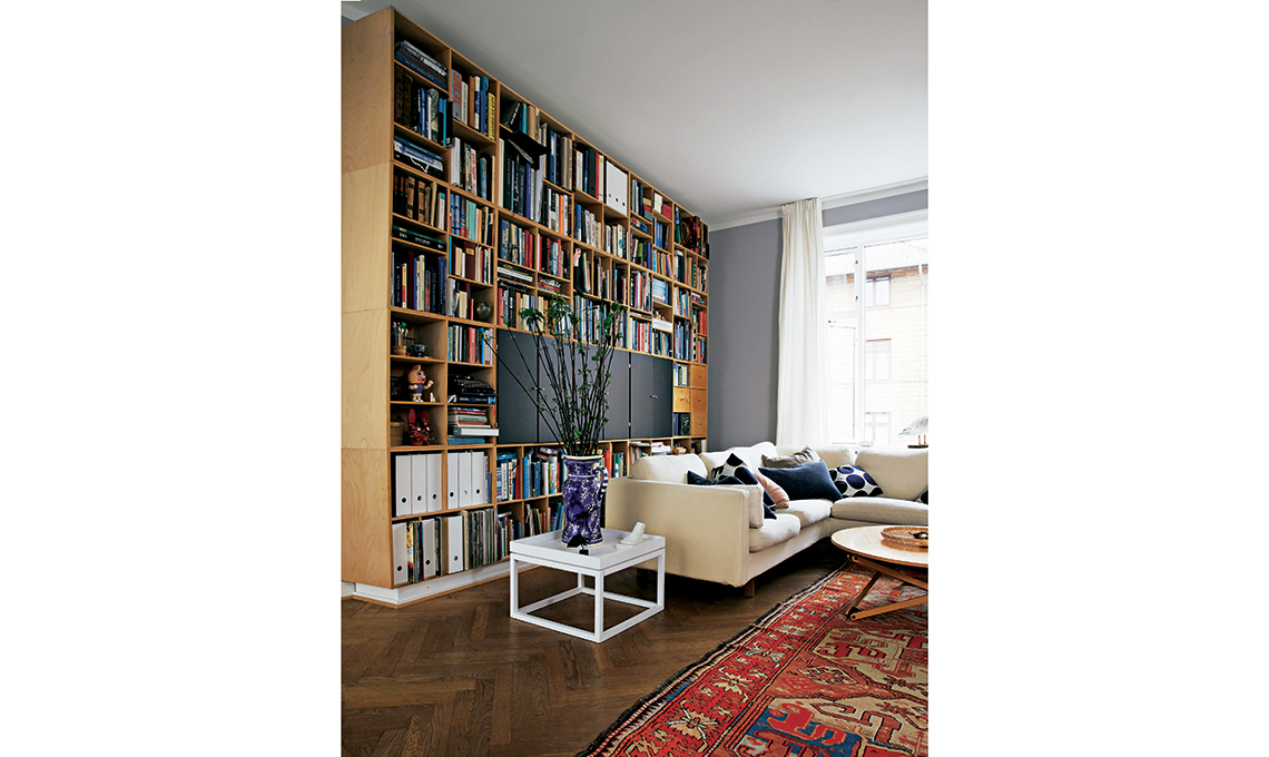 È tutta una questione di equilibri e personalità: la libreria classica dialoga con il tappeto persiano e il vaso di ceramica blu. Stemperano il look il tavolino minimale in white e il divano color burro con cuscini a maxi pois: il tocco décor di Charlotte.