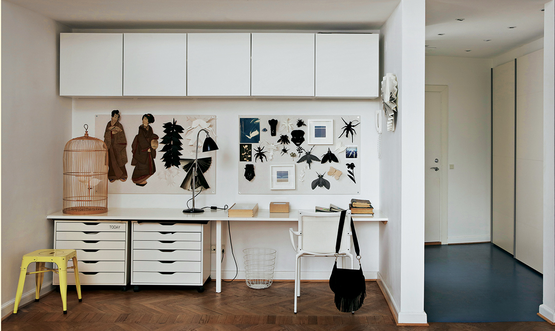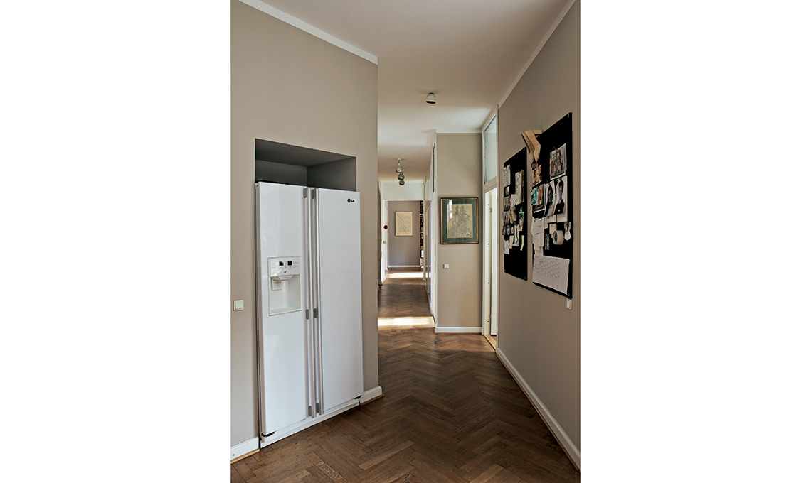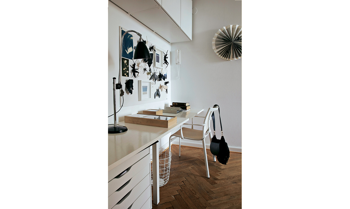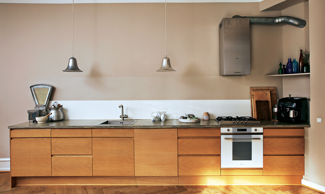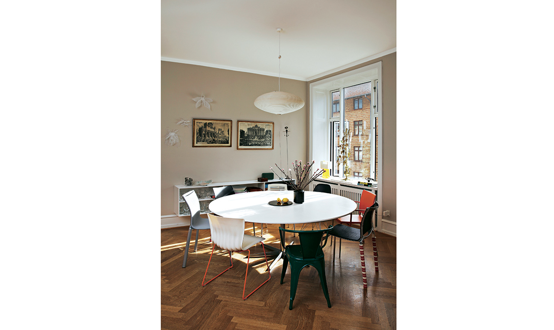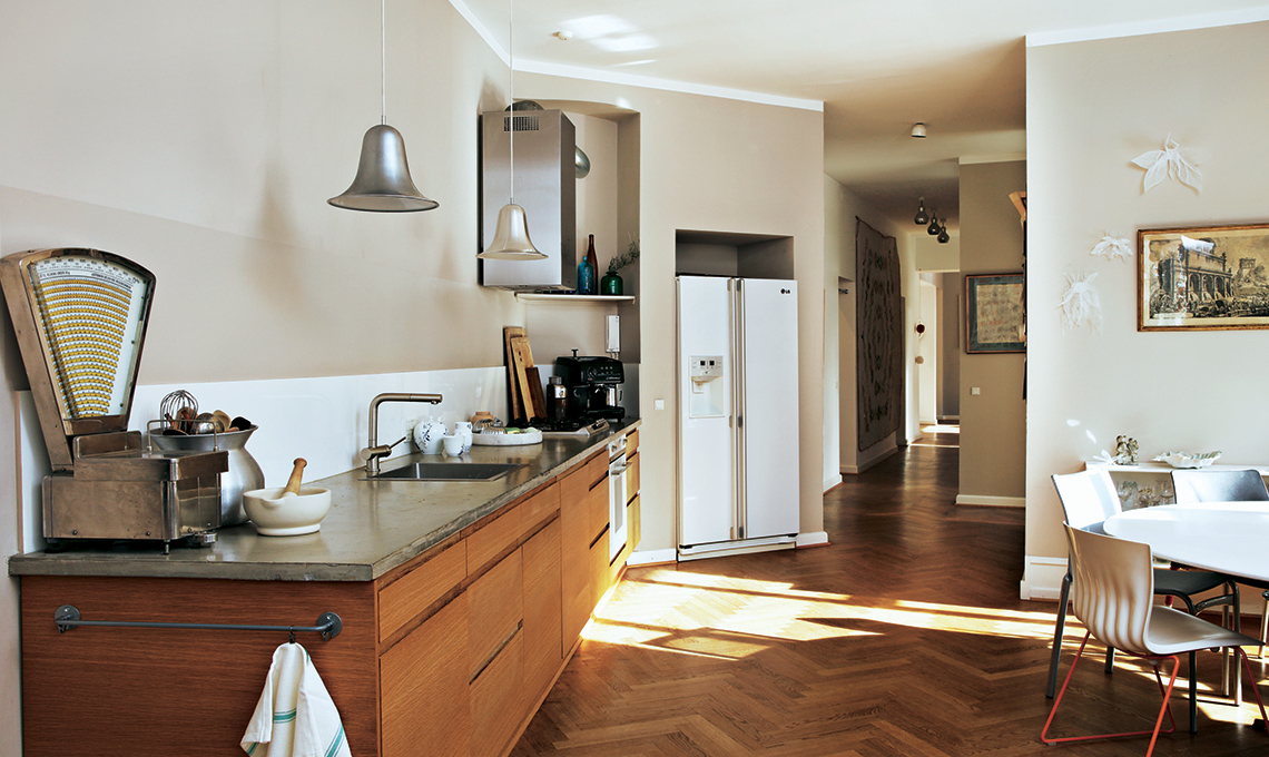 di [Ikea] – fatte realizzare su misura in legno di quercia, come il parquet a spina di pesce. Un continuum visivo con la sala da pranzo open, dove il tavolo con le sedie di design spaiate è il punto focale. Charlotte ha deciso di eliminare anche i pensili, per non appesantire la stanza.