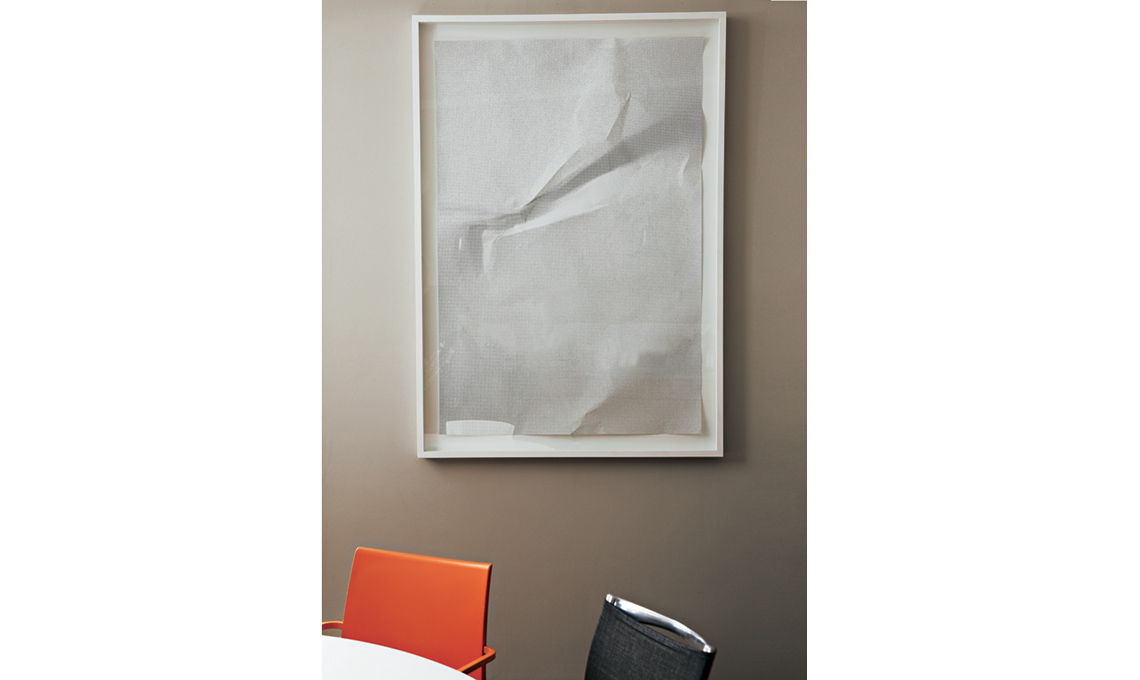 Segue il filo del minimalismo decorativo il quadro che incornicia un foglio di carta stropicciato.