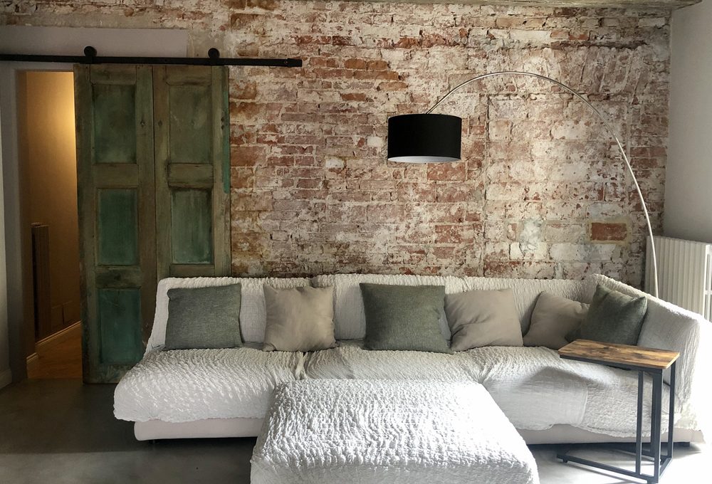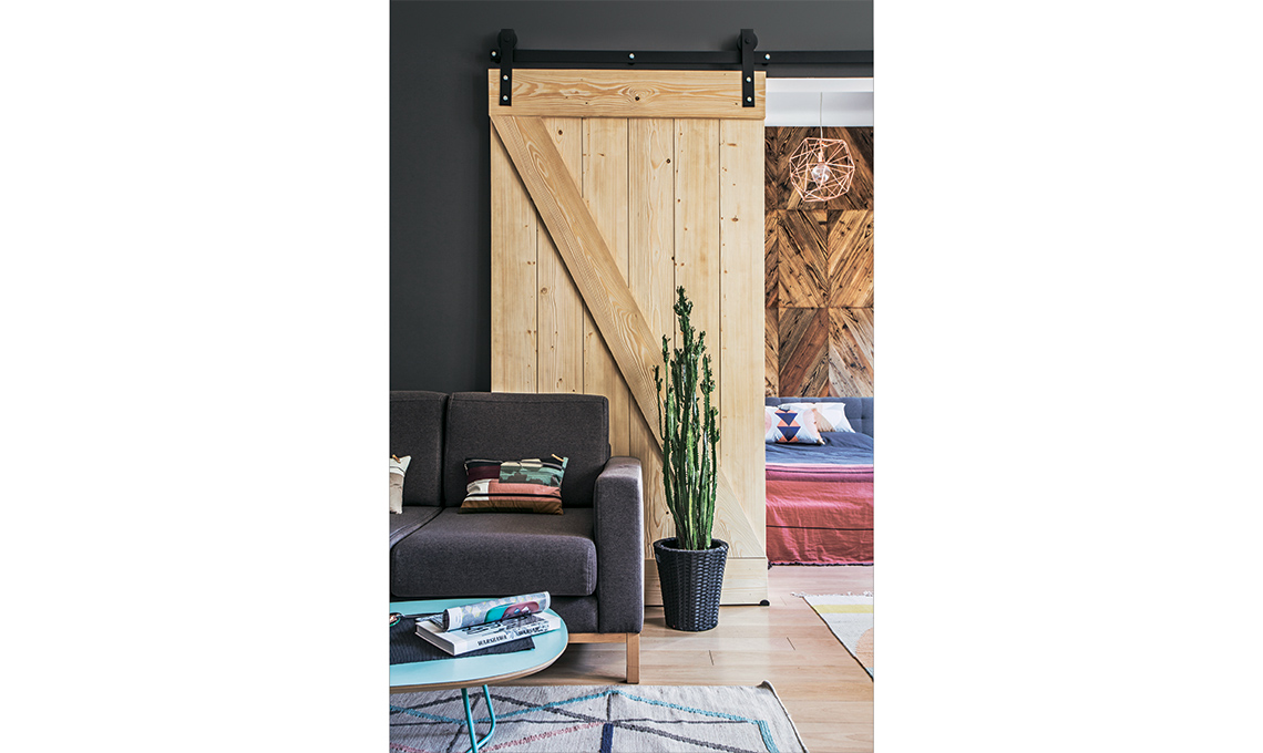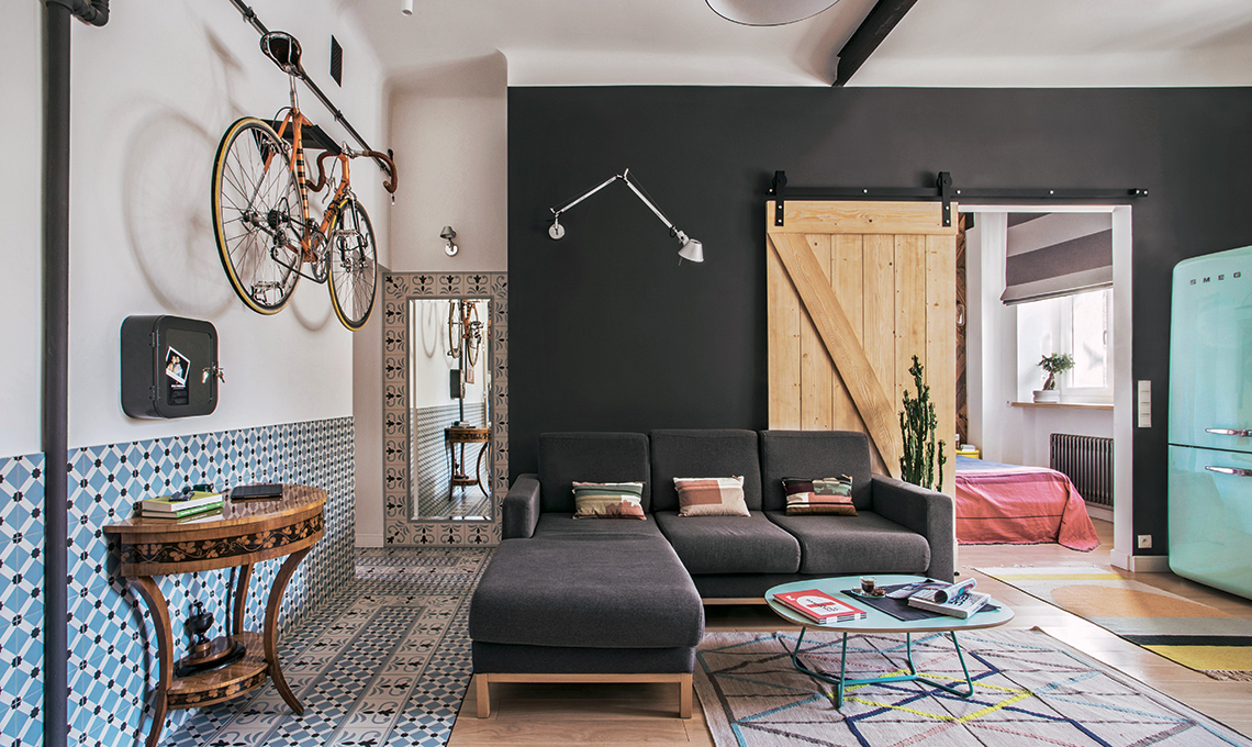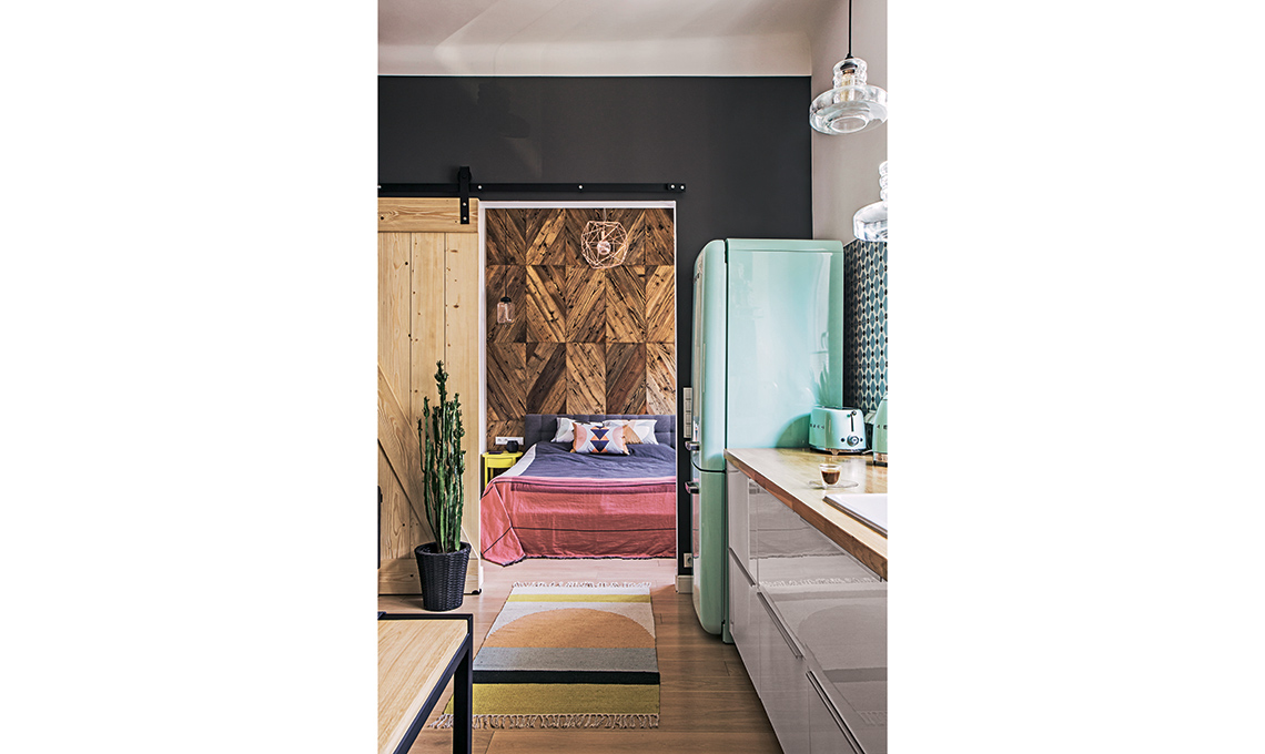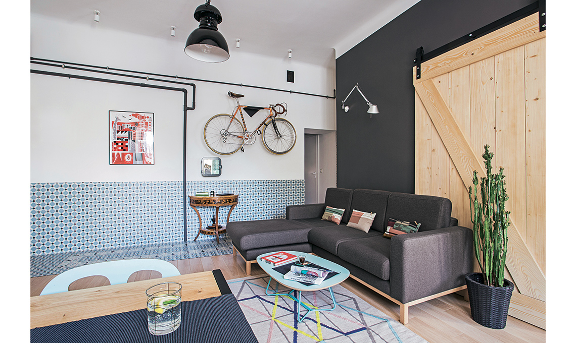 Il taglio datato e poco pratico dell’appartamento con due stanze e cucina andava rivisto. Il restyling dei 60 mq ha portato un living con cucina a vista, due stanze con guardaroba, due bagni e... una sorpresa: via l’intonaco dalla parete della cucina, è stato riportato alla luce un muro perfettamente conservato di mattoni rossi! Da qui, l’idea di seguire la strada del look industriale, sottolineato graficamente dai tubi del gas a vista dipinti di nero che disegnano le pareti.