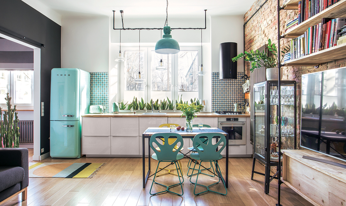 Siamo in Polonia a 'studiate' un nuovo modo di arredare. Qui ai tratti industriali della casa si abbina un décor a base di tonalità soft, dal verde menta all'acqua: il mix ci ha conquistati!