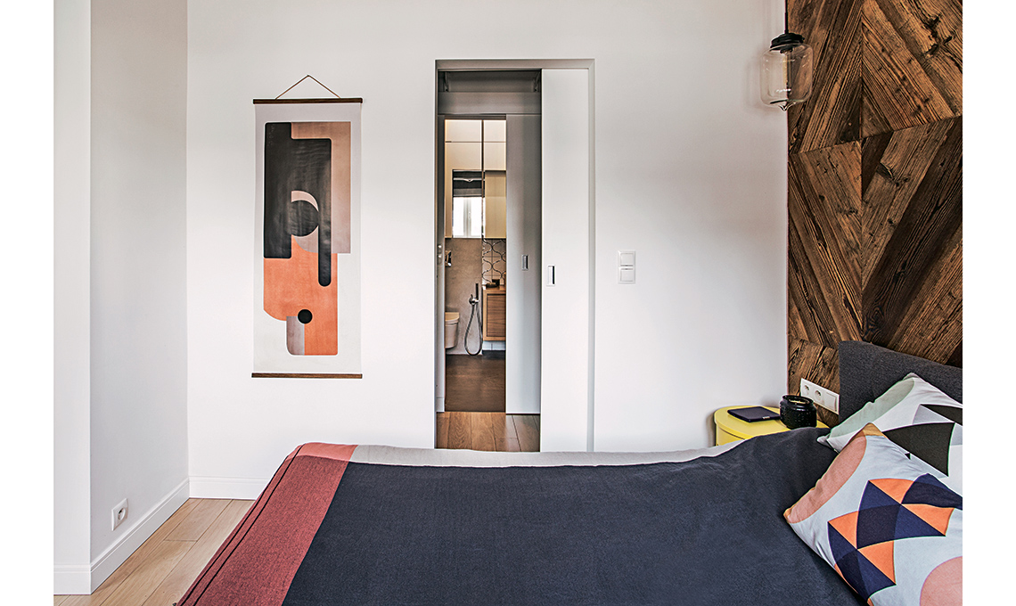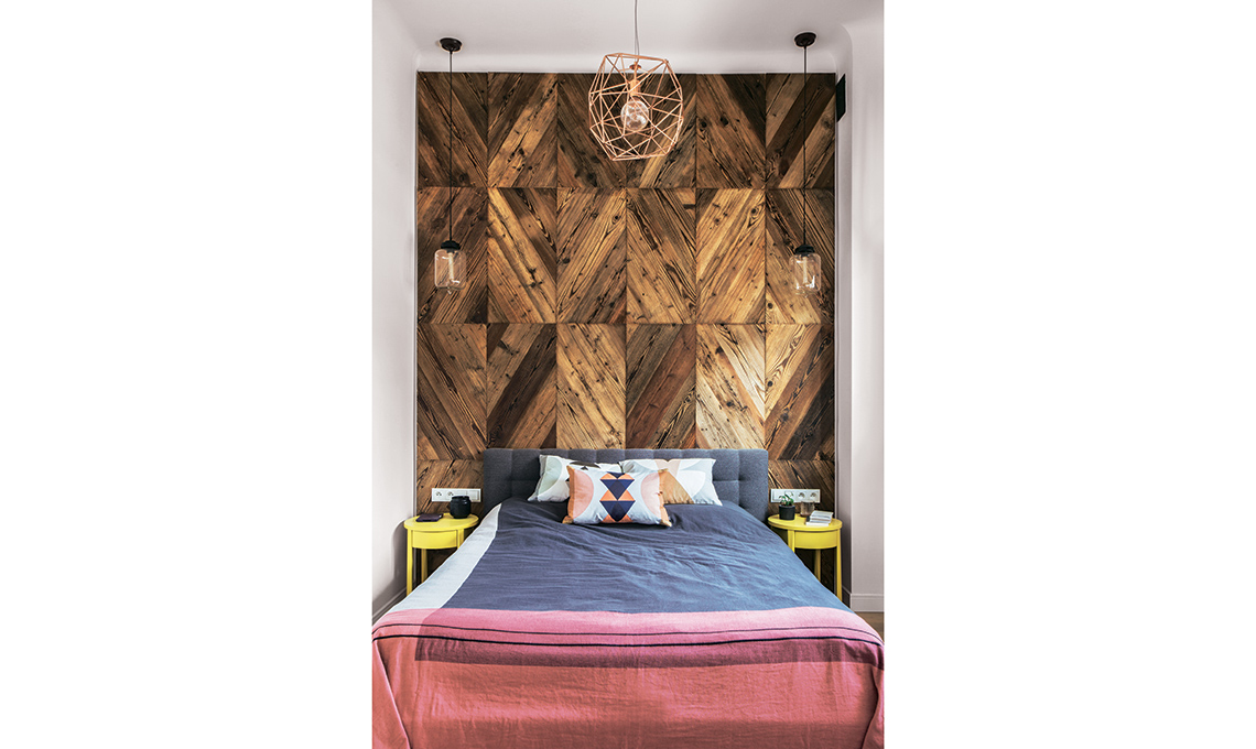 Erano indipensabili vivaci tocchi décor, con gli inserti di piastrelle azulejos e la scenografica testata del letto di listelli di recupero, posati come a creare un murale di legno.