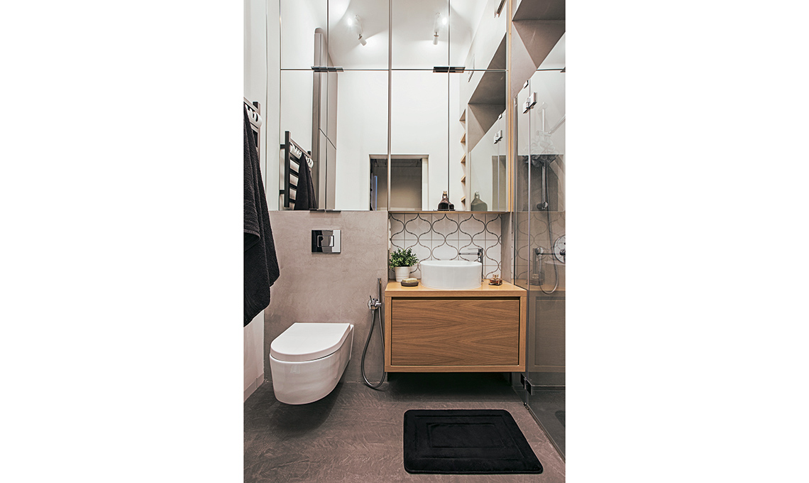 i pensili a specchio: allungano la prospettiva e nascondono la zona storage. Il tocco décor? Le piastrelle con lievi geometrie nella mini- nicchia sopra il lavabo.