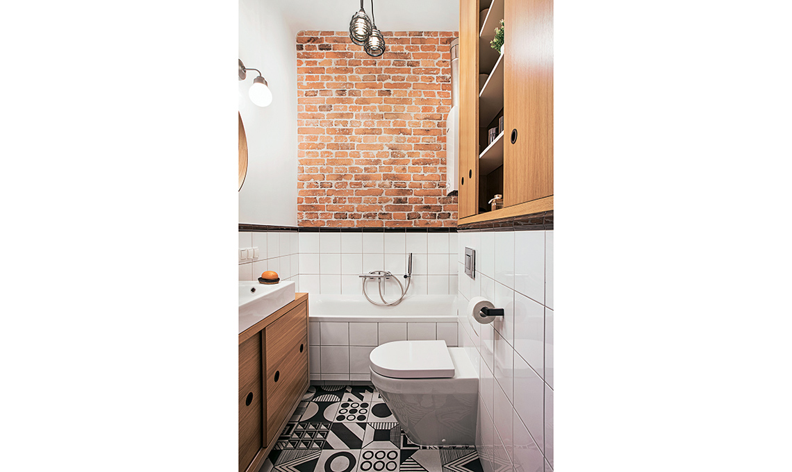 Per bilanciare la parete di mattoni serviva una soluzione décor ‘furba’. Il patchwork di piastrelle in bianco e nero con geometrie pop è stata la scelta vincente. «Mi sembra un tappeto astratto» commenta Kamila «e dà il giusto carattere al piccolo bagno».